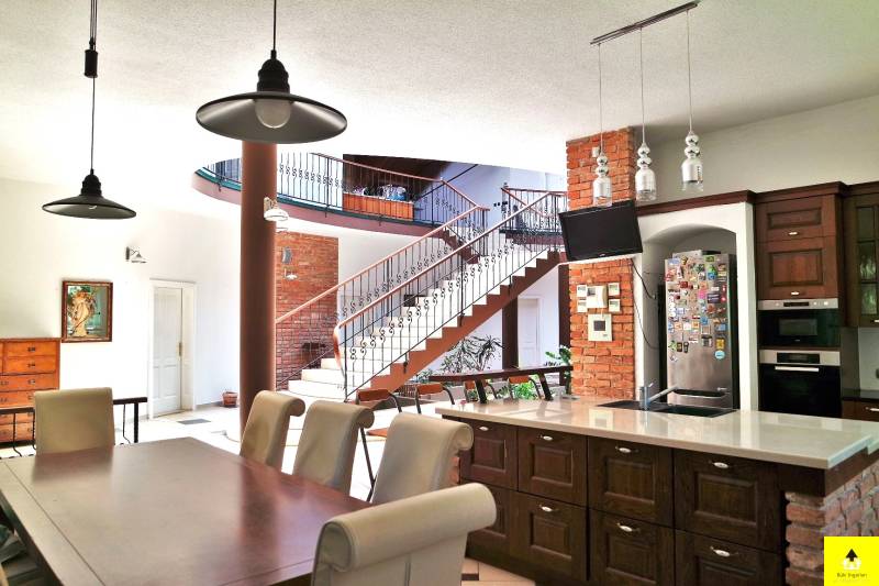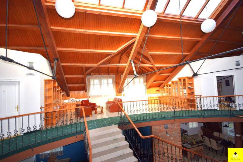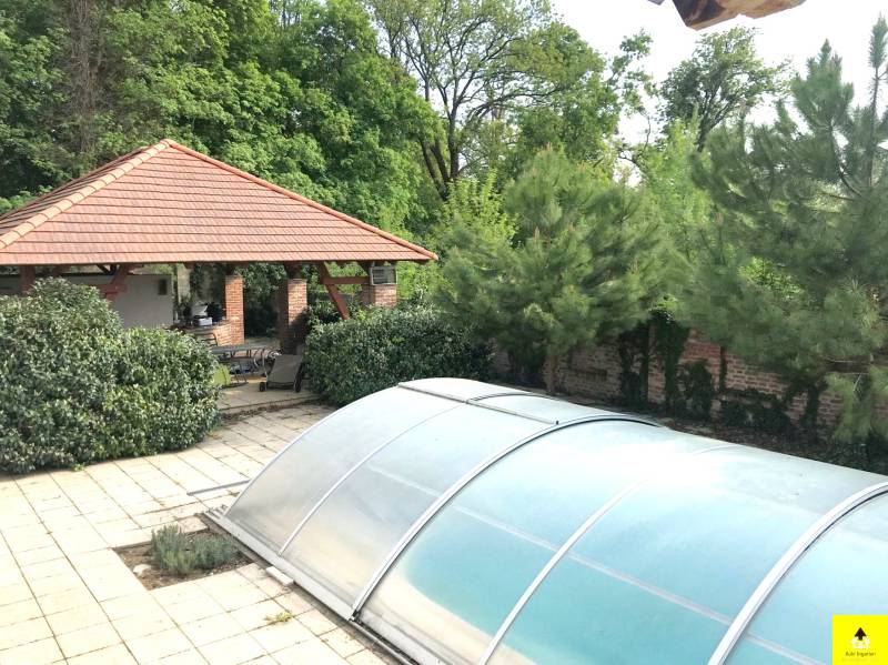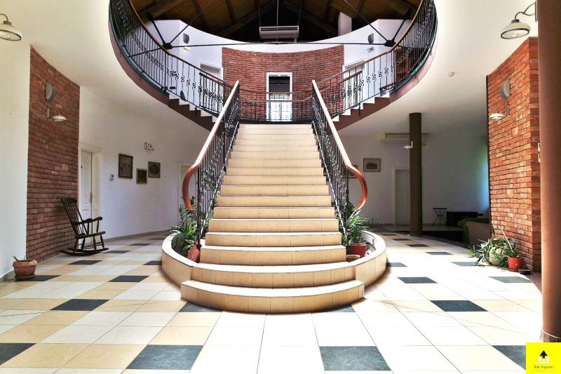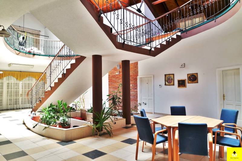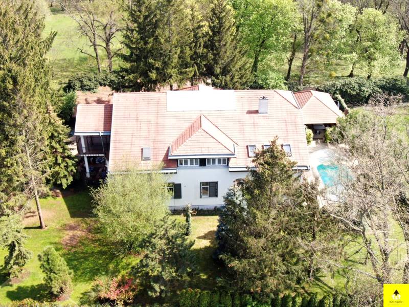 Nagyvonalú, reprezentatív otthon az osztrák határ közelében. Gondozott park által körülvéve, szomszédmentes övezetben áll ez a különleges családi otthon, ahol minden adott, hogy akár nagyobb társasággal is jól érezze magát. Egyedi adottságai és magas komfortszintje miatt kiváló otthona lehet.A kertben méretes, fedett medence, igényesen kialakított nyári konyha, fedett étkező rész, számos tároló, dupla garázs biztosítja, hogy rendezett környezetben pihenhessen. Az épület osztrák alpesi stílusban épült az 1900-as évek elején. Akkoriban a cukorgyár tiszti szállásaként használták. Az épületrőlA ház 340 m2-es földszintje egy hatalmas egybenyitott tér, melyben található egy nappali, egy étkező, egy konyha, melyből eljuthatunk a kinti medencéhez vezető szauna teremhez. Valamint ezen a szinten található még 2 hálószoba és egy tágas fürdőszoba.A földszint díszeként szolgáló impozáns lépcsőn felmenve a szintén 340 m2-es emeletre érkezünk, ahol közösségi térek fogadnak. Innen nyílnak a további helyiségek. Négy hálószoba, egy fürdőszoba, valamint egy tágas fedett terasz.A lakószobák mérete 30 és 35 m2 közöttiek és mindegyik klimatizált. A közösségi terek szintén klimatizáltak és a felülvilágító ablakok teszik világossá.Modernizálás Az ingatlan 1914-ben épült és 2003-ban teljeskörű felújításon esett át. Modernizálása a mai kor igényeinek megfelelően, de az eredeti stílushoz igazodva és hangulatának megőrzésére törekedve történt.A jelenlegi állapot kialakítására, amikor is a korábban egy szintes épület új födémmel, tetőtér beépítéssel két szintes lett. Az emelet a korábbi tetőtérben új födém kialakításával nyerte el mai állapotát. Ekkor került beépítésre az épület meghatározó építészeti eleme, a középen elhelyezett kovácsoltvas elemekkel díszített lépcső, valamint a megnyitott tetőszerkezet eredeti fém támasztó elemei. Mindemellett az épület gépészete és a szigetelése is a 21. századnak megfelelően újult meg.A világítás, az árnyékolók és a 2021 felújított fűtésrendszer kezelését okos otthon rendszer segíti. Az épület kamerarendszerrel, riasztóval és programozható kapcsolókkal (okosház - továbbfejleszthető BUS rendszer) felszerelt.A környezetrőlA birtokra igényes kovácsolt kapukon juthatunk be, melyhez privát úton lehet behajtani. A telek két külön bejárattal rendelkezik, az egyikben automata kapu működik.A 3790 m2-es terület körbekerített, parkosított és ősfák teszik árnyékossá. A 2000 m2-es zöld terület gondozásához 11 körös automata öntözőrendszer került kiépítésre, mely a vizet a helyi kútból veszi. Nagy érték a gondosan ápolt park, mely teljes védettséget nyújt, az amúgy is eldugott helyen lévő kúriának.A telken található egy 110 m2-es melléképület, egy 35 m2-es dupla garázs, egy 36 m2-es kerti épület és egy kültéri medence.A főépület egyik sarka alatt 25 m2-es borospince található, mely kiválóan alkalmas bor tárolásra, de egy kis elvonulós borozgatásra is ideális. Ezen a részen kapott helyet egy szauna, szolárium és zuhanyzó helyiség is, valamint innen irányítható a kültéri medence gépészete.Alapterület:• 340 m2 x 2 (földszint + emelet)Szobák száma:• Fsz: 2 • Emelet: 4Fürdőszobák, WC-k:• Fsz: fürdőszoba, WC-vel, bidével gőzkabinnal + különálló WC• Emelet: fürdőszoba, WC-vel, bidével• Kert: WCFűtése: • Gázzal + Inverteres klíma (hőcserélős)• Vaillant EcoTec kazán (idei) + medence kör.• Padlófűtés külön körön alul-felül + radiátorokMedence:• 8.48 X 4.5 méter• 58 köbméter• WaterAir rendszerrelOkosház, biztonságtechnika:• riasztó• programozható kapcsolók (okosház - továbbfejleszthető BUS rendszer)• kamera rendszer• 11 körös öntözőrendszer fúrt kúttalGarázs:• 36 m2 (2 autó)Fedett terasz:• 56 m2• infra fűtés• bárpult• kültéri konyha kialakításMelléképület: • 110 m2, 4 különválasztott, külön bejárattal rendelkező helyiségből áll |