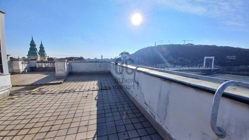 A Belváros közepén, páratlan panorámájú épületben kiadó !Az épület 5. emeletén 272 m2 + a 6. emeleten 161 m2 terasz bérelhető egyben. Tulajdonosok engedélyezik a területen mini-szálláshely/ hotel, apartmanok létesítését, kiadást. A legfelső emelet páratlan panorámája adja a lehetőséget egy kávézó kialakítására. NEM ELADÓ sem külön, sem egyben, azonban bérelhető egyben. A helyiségek a képeken látható állapotban vannak, tulajdonos engedélyezi a felújítást, javításokat előzetesen egyeztetett költségvetés alapján. A felújítás költségei lelakhatók, tehát elsősorban hosszútávú bérlőket keresünk.Az irodát jelenleg már nem használják, így azonnal költözhető, A ház műemlék épület, különleges hangulata van, itt bérelni igazi kuriózum.A bérlők kényelmét 2 lift is szolgálja, az irodákhoz természetesen közös helységek is használhatók. (konyha, mosdók )A bérleti díj : 4,333.- EUR + ÁFA / hó , mely tartalmazza a rezsi költséget is ! |