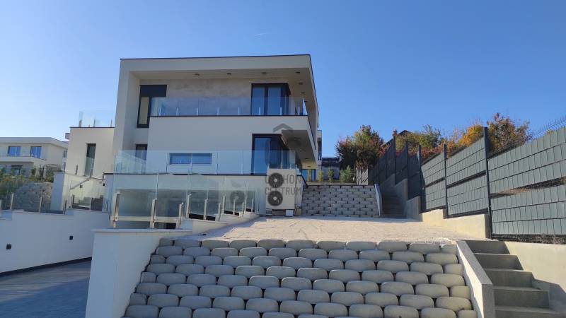 ÚJ ÉPÍTÉSŰ CSALÁDIHÁZ CSODÁS PANORÁMÁVAL LUXUS KIVITELBENKÖRNYEZETA telek,- amelyen az építkezés megvalósul, Aranyhegy tetején található, ahonnan csodálatos örökpanoráma nyílik a környező dombokra, erdőkre és a távolabbi tájra.A környéken csupa újépítésű családi- és társasház található, így az rendezett, kellemes.Távol esik valamennyi fűúttól, igy roppant csendes is. Ennek ellenére jó a közlekedése, 3 perc könnyű sétával elérhető a BKK buszjárat (219-es autobusz).ÉPÜLETMinimál stílusú, modern épület a ma elérhető legjobb alapanyagokból és valóban gyönyörűen kivitelezve.Harmónikus elegye a légies eleganciának és a mindennapi praktikumnak. A fejlesztőnek nem az első kivitelezése , több évtizede működik a piacon, referenciamunkák a kerületben megtekinthetőek. Itt is, - mint mindig - szívvel-lélekkel dolgozott, így az eredmény sem maradt el! A ház bruttó alapterülete teraszokkal együtt 240 nm. Nettó alapterülete 185,65 nm, összesen 3 szinten.A garázsban 2 gépkocsinak van beállási lehetősége, plusz motor, kerékpárok elférnek.A földszinten a nappali-konyha-étkező egysége mellett egy szülői háló is helyet kapott saját fürdőszobával, gardróbbal.Az emeleten három hálószoba, gardrób és nagy fürdőszoba valamint egy óriási panorámaterasz található.A házhoz tartozik 55 nm burkolt terasz, valamint 27 nm zöldtetős terasz.A telek nagysága 642,5 nm, így a házat mintegy 480 nm kert öleli körbe, ahol már gyönyörűen zöldell a fű, locsol az autómata, sőt az autómata fűnyiróhoz is a szegélyezés előkészítve.MŰSZAKI PARAMÉTEREK•Hőszivattyú, (hűtés -fűtés). mennyezet illetve padló hőleadással •Napelem előkészítés.•Részben okos otthon (redőnyök működtetése, fűtés-hűtés és világítás telefonról működtethető)•Nyílászárók 3 rétegű üveg, tiszta fa nyílászárók.•Bejárati ajtók tiszta fa.•Villeroy és Laufen fajanszok•Hansgrohe csaptelepek•Automata redőnyrendszerek (Atenád)•Szúnyoghálók, pliszé szúnyoghálók•Elektromos autótöltő kiállás•Vízlágyító berendezés beszereléséhez gépészet előkészítve (csövezés a konyháig...)Az építkezés befejeződött. Még egy szép konyha is részét képezi az árnak, sőt sok apró meglepetés is bekerült,- jöjjön és tekintse meg! |