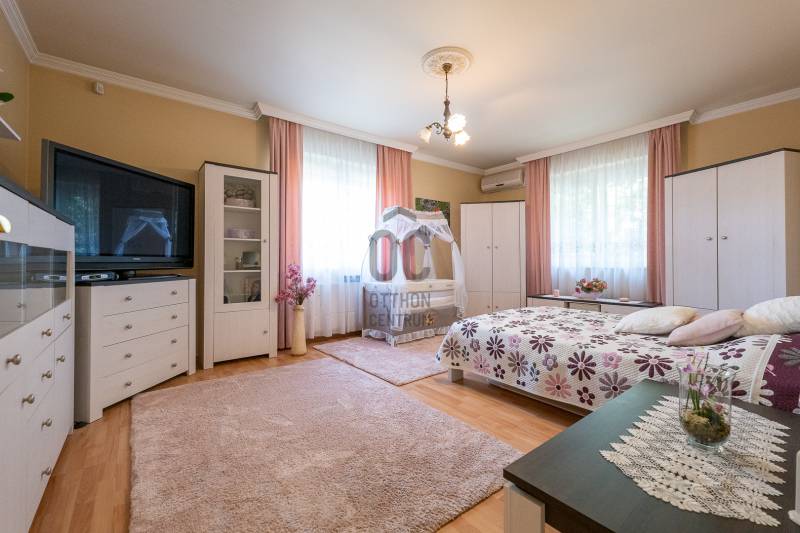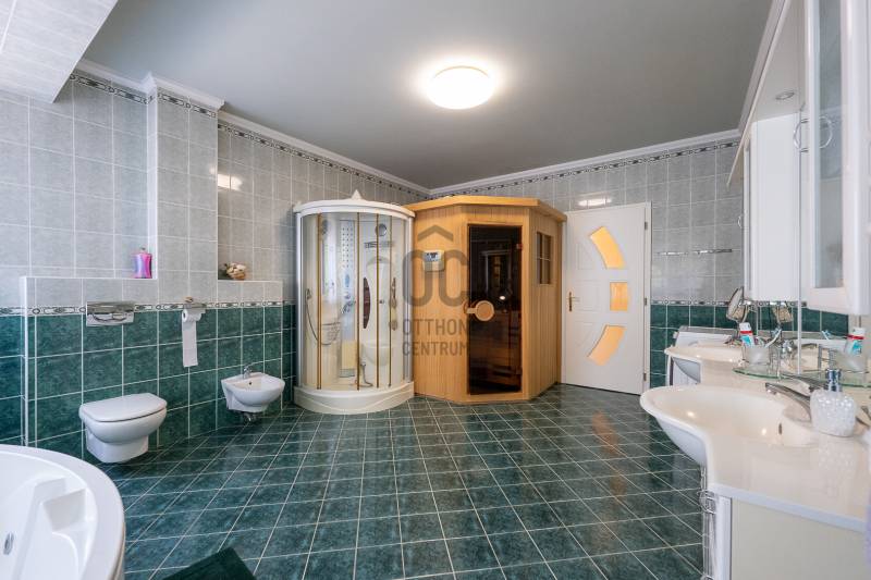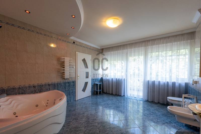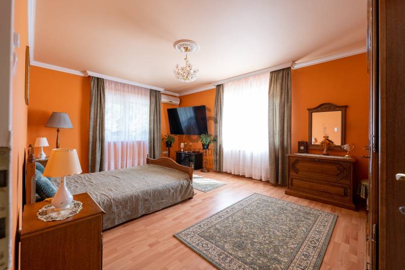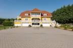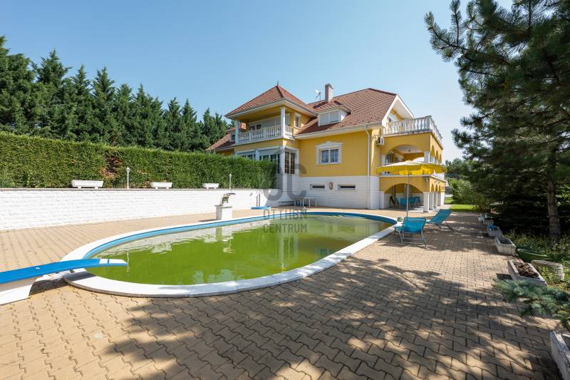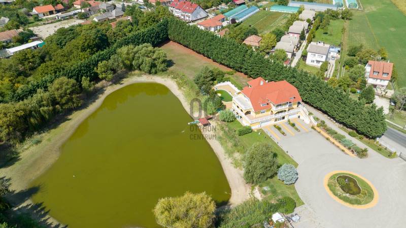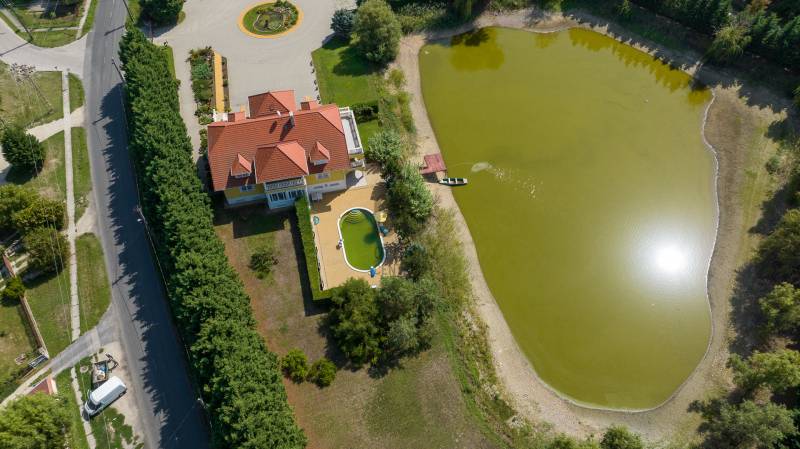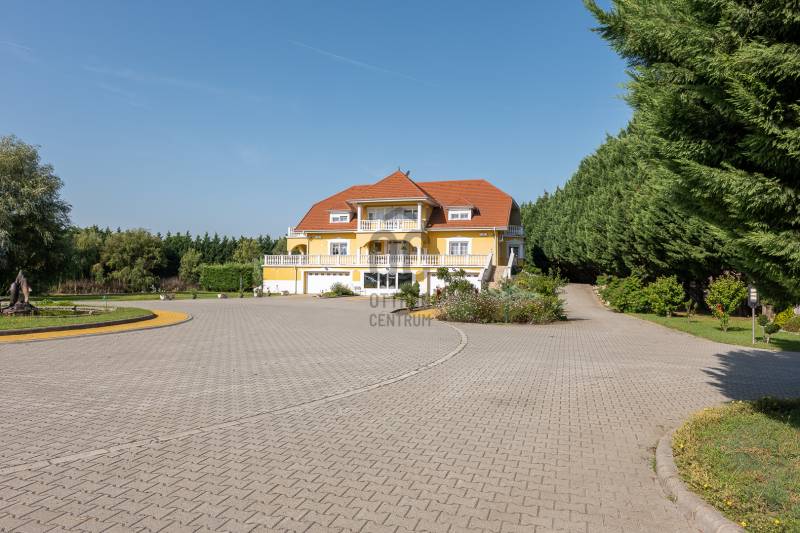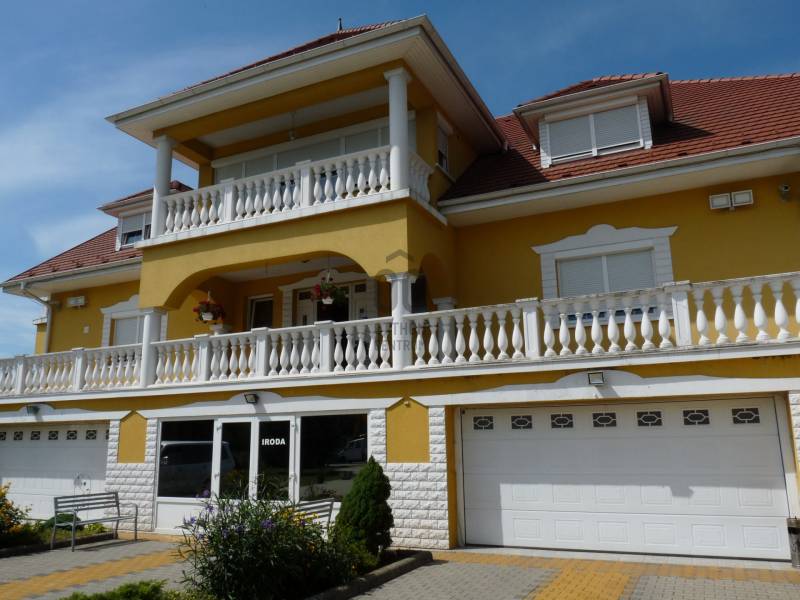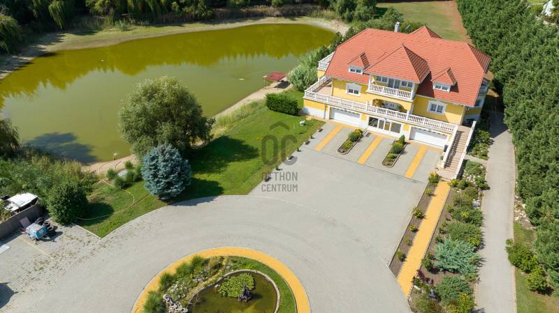 Az ingatlan 2004-ben ytong téglából épült, nettó 680 m2-es, bruttó 845 m2. A telek mérete 18441 m2 nagyságú. A ház 2 nappalival és 8 lakószobával rendelkezik, tartozik hozzá egy kb. 8000 m2-es saját halas tó, hatalmas térkövezett parkoló, és medence.Pazar teraszok és erkélyek, összesen kb. 160 m2-en!Az épület 3 szinten helyezkedik el.A pince szint 290 m2 nagyságú, 3 külön bejáratú garázs (kb. 12 gépjármű parkolása oldható meg itt) és két tároló helységekből áll.Földszinten (235 m2 nagyságú) nappali, hall, 2 nagy szoba, konyha-étkező, kamra, fürdőszoba (szaunával), közlekedő, mosdó és gardrób található valamint az emeleten (155 m2 nagyságú) nappali és hat szoba, fürdőszoba, és gardrób.Fűtése, gázkazánról, radiátorokkal és a hideg burkolatos helységekben padlófűtéssel, illetve a nappaliban elhelyezett fatüzelésű kandallóval biztosítható, hűtése 6 db klímaberendezéssel.Az udvar térkővel és murvával borított részén kb. 60 gépjármű parkolása megoldható.A családi ház funkcióján kívül, az ingatlan adottságait, belső elrendezését figyelembe véve, alkalmas lehet kis, vagy közepes ügyfél forgalommal rendelkező cégek, intézmények székházának is.Kivételes adottságú ingatlan, további információért kérem keressen! |