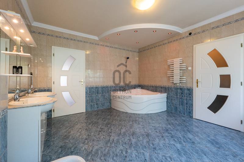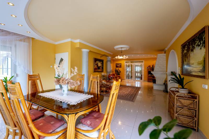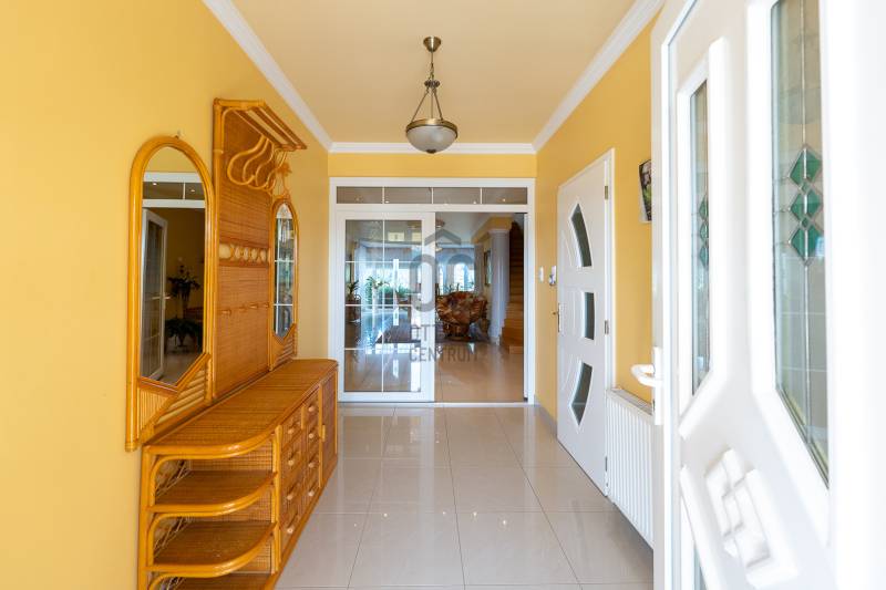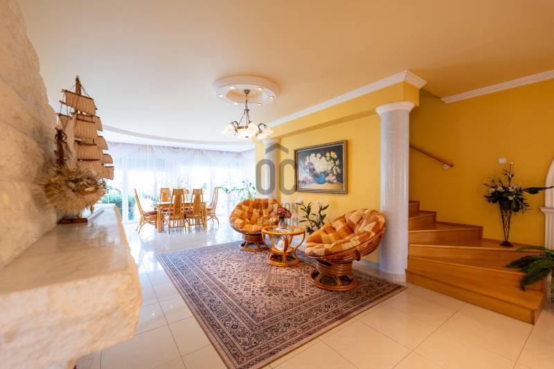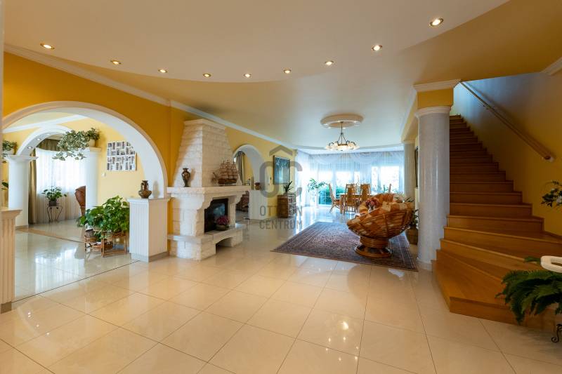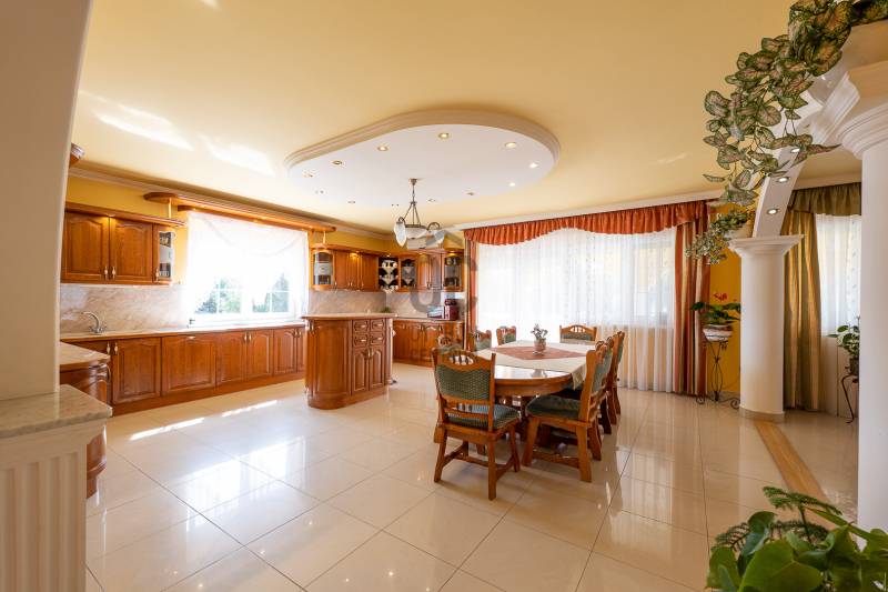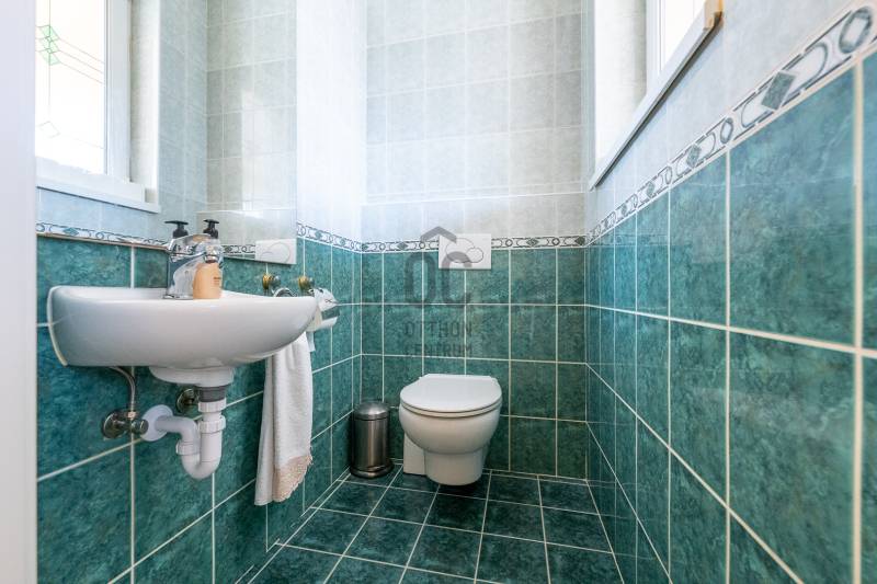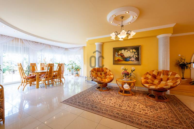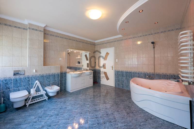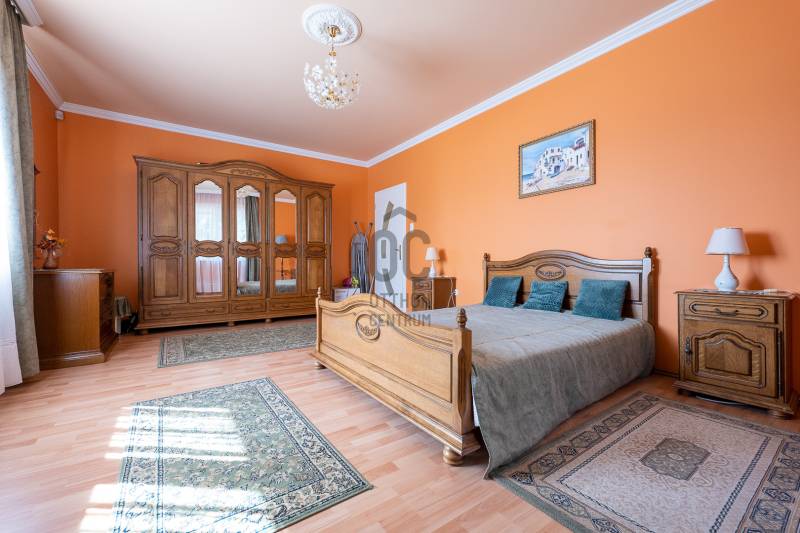 Az ingatlan 2004-ben ytong téglából épült, nettó 680 m2-es, bruttó 845 m2. A telek mérete 18441 m2 nagyságú. A ház 2 nappalival és 8 lakószobával rendelkezik, tartozik hozzá egy kb. 8000 m2-es saját halas tó, hatalmas térkövezett parkoló, és medence.Pazar teraszok és erkélyek, összesen kb. 160 m2-en!Az épület 3 szinten helyezkedik el.A pince szint 290 m2 nagyságú, 3 külön bejáratú garázs (kb. 12 gépjármű parkolása oldható meg itt) és két tároló helységekből áll.Földszinten (235 m2 nagyságú) nappali, hall, 2 nagy szoba, konyha-étkező, kamra, fürdőszoba (szaunával), közlekedő, mosdó és gardrób található valamint az emeleten (155 m2 nagyságú) nappali és hat szoba, fürdőszoba, és gardrób.Fűtése, gázkazánról, radiátorokkal és a hideg burkolatos helységekben padlófűtéssel, illetve a nappaliban elhelyezett fatüzelésű kandallóval biztosítható, hűtése 6 db klímaberendezéssel.Az udvar térkővel és murvával borított részén kb. 60 gépjármű parkolása megoldható.A családi ház funkcióján kívül, az ingatlan adottságait, belső elrendezését figyelembe véve, alkalmas lehet kis, vagy közepes ügyfél forgalommal rendelkező cégek, intézmények székházának is.Kivételes adottságú ingatlan, további információért kérem keressen! |