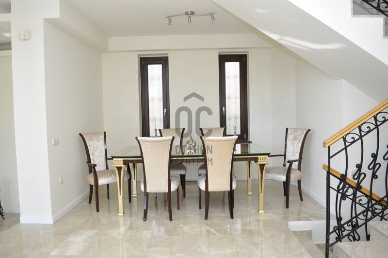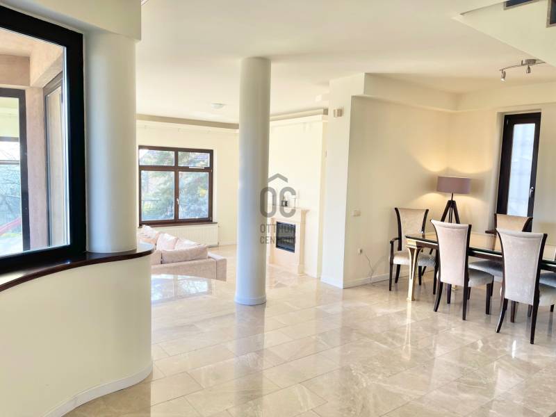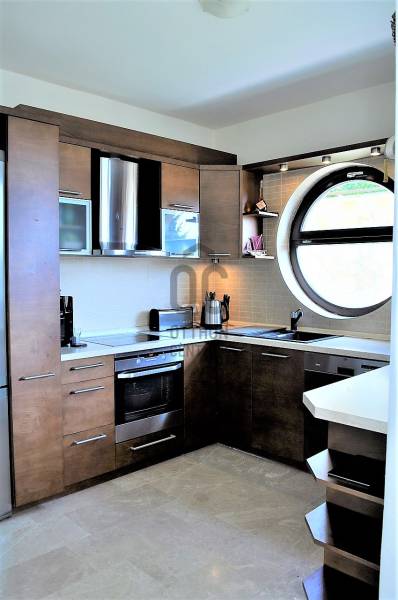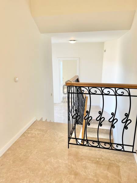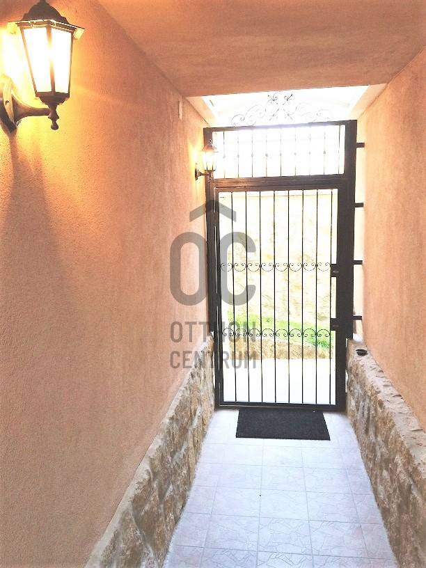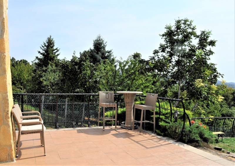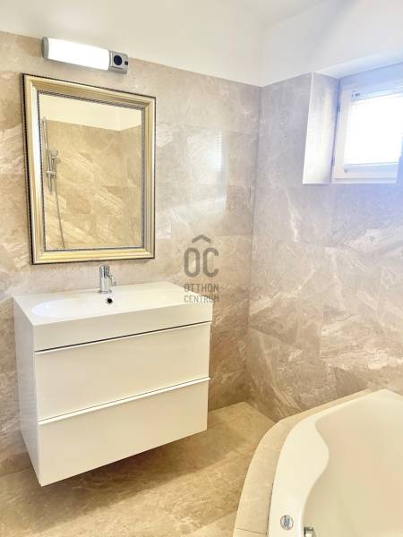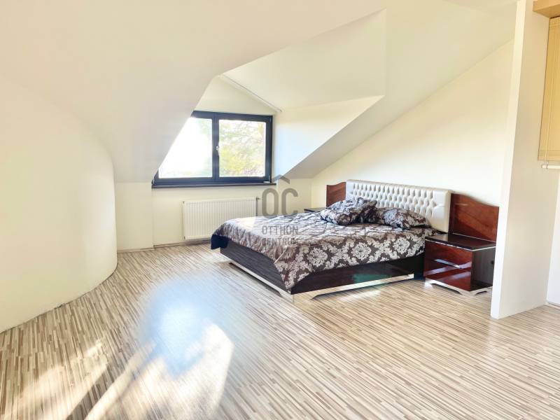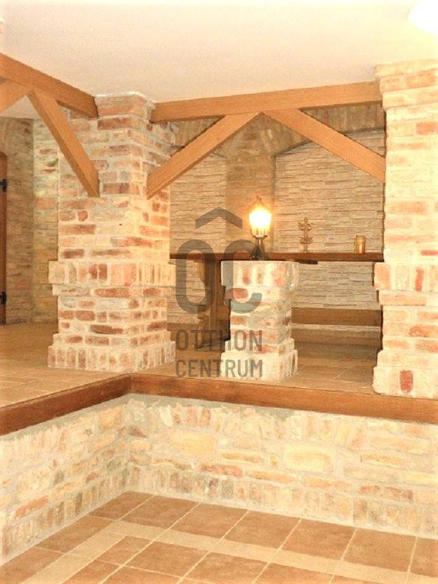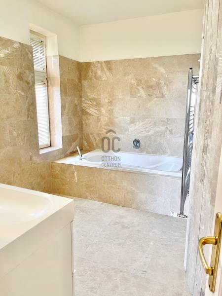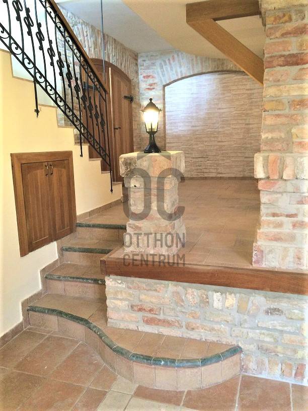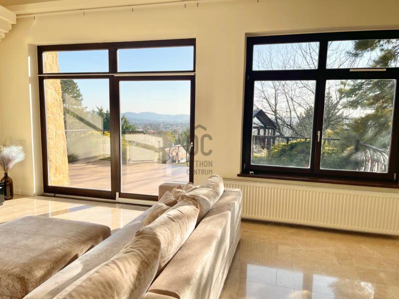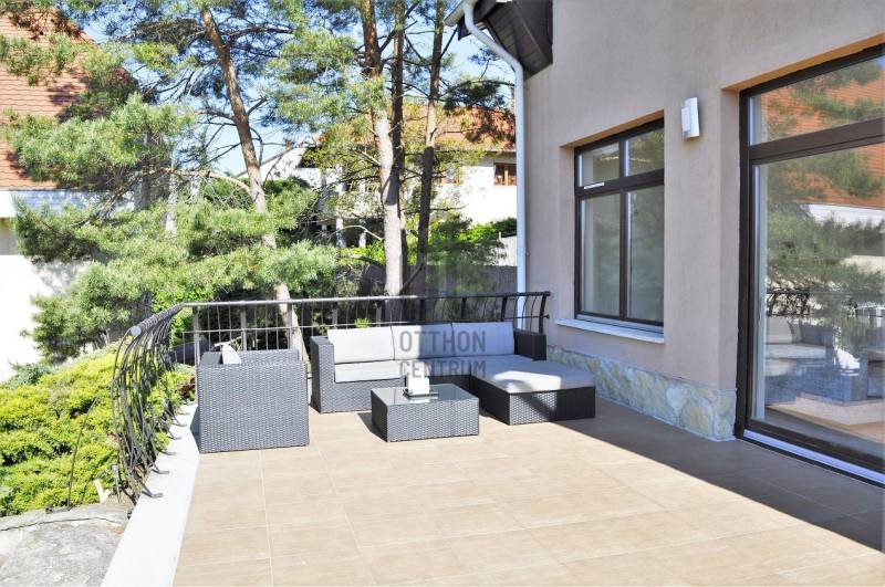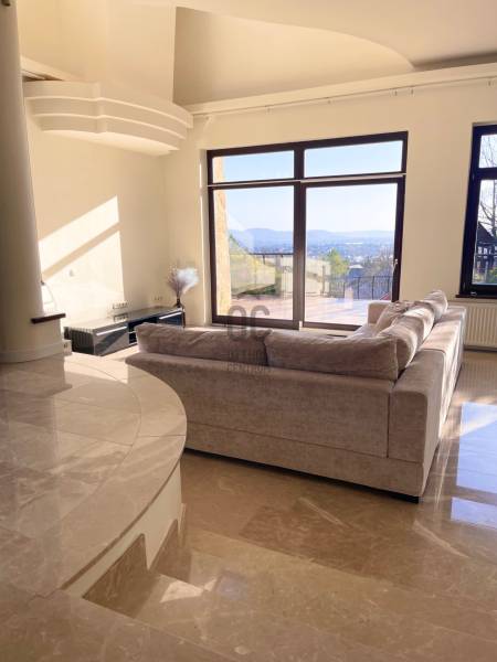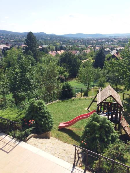 Eladó Budakeszi különleges, panorámás domboldali, erdő közeli csendes területén, DNy-i fekvésű, nettó 280 nm-es, kiváló állapotú, nívós családi ház. Az egyedi belső tér elosztású ingatlan jellemzői az igényes kivitelezés, kiváló, minőségi anyagok, tágas világos terek.Belépve a ház főbejáratán az előszobába érkezünk, szintén ide érkezünk a garázsból is, majd az előtérbe jutunk, innen nyílik egy szoba, gardrób, WC-kézmosó és egy fürdőszoba, majd a tágas hall, konyha-étkező, kamra, tovább néhány lépcsővel lejjebb a nagyméretű, világos, panorámás nappali. A nappaliból valamint az étkezőből is a D-i, DNy-i fekvésű, részben fedett, hatalmas kertkapcsolatos, panorámás teraszokra jutunk. Az emeleti szinten közlekedőt, gardróbot, három hálószobát, kettő fürdőszobát és kényelmes teraszt találunk. A pinceszinten háztartási helyiséget, kazánházat, fitnesz részt (hidromasszázs), fürdőszobát, kettő nagy méretű tárolót, valamint pincerészt találunk.Extraként említésre méltó a ház teljes szigetelése, hűtő-fűtő klíma minden helyiségben, fűtött gépkocsi behajtó, fűtött garázs, automatizálás, nappaliban márványkandalló, márványburkolatok, Villeroy&Boch szaniterek, AEG konyhai gépek, Vaillant kazán, riasztórendszer, kültéri kamera, video kaputelefon.A gondozott kertben örökzöldek, lombhullatók, cserjék, virágok mind megtalálhatóak.A kétállásos garázson kívül a kertben még 2-3 autó parkolására van lehetőség. |