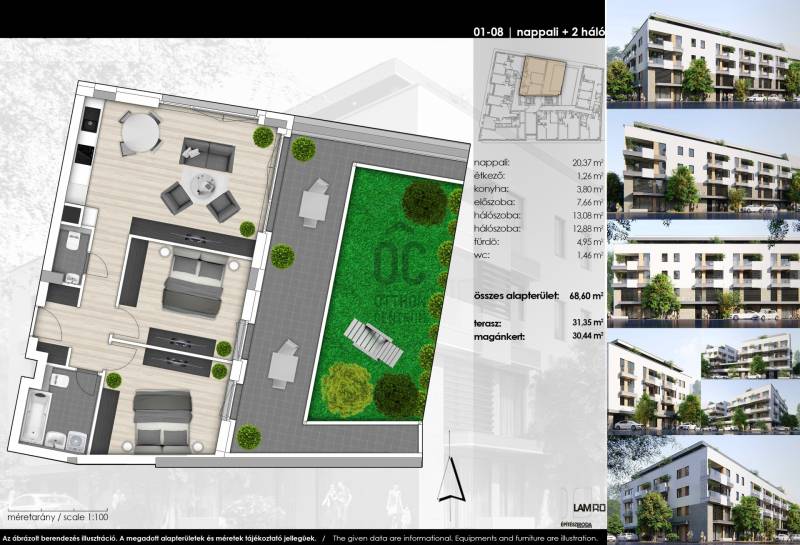 A lakás az első emeleten helyezkedik el, 68 m2 alapterületű, tartozik hozzé 31 m2-es terasz, és 30 m2 kertkapcsolat, keleti-fekvésű, 108-as ajtószám.Budapest 4.kerületében, Újpest központtól 350 méterre épülő társasházban teljesen új építésű lakások várják új lakóit!A társasház 3 lakószintes és 2 garász szinttel rendelkezik, amiben összesen 33 lakás épül.A ház modern, fiatalos és leginkább környezetbarát lesz. A fűtést központi hőszivattyú látja el, ami szobánkként elhelyezett Fan-Coil kiállások biztosítják a kényelmet és a fenntartási költségek csökkentését.A lakások elhelyezkedése, fekvése és belső kialakítása lehetővé teszi családosok és egyedülállóknak is kényelmes, nyugodt élet körülményeket.Minden belső design, elosztás és felszereltség a mai kornak megfelel és minőségű burkolatokkal és szaniterekkel kerül átadásra, ami jelen szakaszában akár lehetőségük nyílik arra is, hogy megvásárolt otthonukat az utolsó részletig személyre szabhassák, továbbá széles kollekcióból választhatnak. Az alapáras burkolatokon felül, elérhetőek feláras termékek is, mely biztosítja, hogy személyiségük otthonukban is vissza tükröződhessen.Remek elhelyezkedésének köszönhetően, mind gyalog, autóval és tömegközlekedéssel is könnyen megközelíthető. Kiváló infrastruktúra jellemzi, legyen szó bevásárlásról, vendéglátó egységekről, szolgáltatói szektorról vagy park és játszóterekről. Bölcsőde, óvoda, iskola minden séta távra elérhetőek, akárcsak az orvosi rendelők és köz intézmények.A társasház összesen 3 lakószintből, egy földszinti parkoló és egy mélygarázs szintből áll. A lakásokhoz vásárolható mélygarázs beálló és tároló is, de a nagy érdeklődésre való tekintettel ezek korlátozott számban elérhetőek!Emellett két lakásnak saját kert rész is jár a társasházban, így lehetőséget biztosítunk a zöldövezetben való pihenésre és kikapcsolódásra.A gépkocsik elhelyezésére a teremgarázsban kínálunk lehetőséget a -1 és földszinten, ahol számos különálló és zárható tárolóhelyiséget is kialakítunk, változatos méretekben. Gondoltunk azokra is, akik környezet-tudatosak és elektromos töltési lehetőséggel rendelkező beállót szeretnének, ami külön megrendelhető.Összességében a ház egy modern és környezetbarát közösség részét képezi, ahol a városi nyüzsgést és a zöld környezet nyújtotta lehetőségeket egyaránt élvezheti.Abban bízunk, hogy az ingatlanpiacon szerzett sok éves tapasztalatunk, meggyőző referenciáink sokakban ébresztenek bizalmat és számos magas elvárásokkal rendelkező igényes vásárlónknak építhetünk modern, a jövőt megidéző, egyedi otthont, amely kimagaslóan magas megtérüléssel hálálja meg tulajdonosa befektetését.Amennyiben igazán egyedi, minőségi és modern házban keres új otthont, akkor keressen fel minket és hivatkozzon az \"Új élet\" projektre, hogy Ön is megkezdhesse itt életét!Projekt bemutatásaBudapest 4.kerületében, Újpest központtól 350 méterre épülő társasházban teljesen új építésű lakások várják új lakóit!A társasház 3 lakószintes és 2 garász szinttel rendelkezik, amiben összesen 33 lakás épül.A ház modern, fiatalos és leginkább környezetbarát lesz. A fűtést központi hőszivattyú látja el, ami szobánkként elhelyezett Fan-Coil kiállások biztosítják a kényelmet és a fenntartási költségek csökkentését.A lakások elhelyezkedése, fekvése és belső kialakítása lehetővé teszi családosok és egyedülállóknak is kényelmes, nyugodt élet körülményeket.Minden belső design, elosztás és felszereltség a mai kornak megfelel és minőségű burkolatokkal és szaniterekkel kerül átadásra, ami jelen szakaszában akár lehetőségük nyílik arra is, hogy megvásárolt otthonukat az utolsó részletig személyre szabhassák, továbbá széles kollekcióból választhatnak. Az alapáras burkolatokon felül, elérhetőek feláras termékek is, mely biztosítja, hogy személyiségük otthonukban is vissza tükröződhessen.Remek elhelyezkedésének köszönhetően, mind gyalog, autóval és tömegközlekedéssel is könnyen megközelíthető. Kiváló infrastruktúra jellemzi, legyen szó bevásárlásról, vendéglátó egységekről, szolgáltatói szektorról vagy park és játszóterekről. Bölcsőde, óvoda, iskola minden séta távra elérhetőek, akárcsak az orvosi rendelők és köz intézmények.A társasház összesen 4 lakószintből, egy földszinti parkoló és egy mélygarázs szintből áll. A lakásokhoz vásárolható mélygarázs beálló és tároló is, de a nagy érdeklődésre való tekintettel ezek korlátozott számban elérhetőek!Emellett két lakásnak saját kert rész is jár a társasházban, így lehetőséget biztosítunk a zöldövezetben való pihenésre és kikapcsolódásra.A gépkocsik elhelyezésére a teremgarázsban kínálunk lehetőséget a -1 és földszinten, ahol számos különálló és zárható tárolóhelyiséget is kialakítunk, változatos méretekben. Gondoltunk azokra is, akik környezet-tudatosak és elektromos töltési lehetőséggel rendelkező beállót szeretnének, ami külön megrendelhető.Összességében a ház egy modern és környezetbarát közösség részét képezi, ahol a városi nyüzsgést és a zöld környezet nyújtotta lehetőségeket egyaránt élvezheti.Abban bízunk, hogy az ingatlanpiacon szerzett sok éves tapasztalatunk, meggyőző referenciáink sokakban ébresztenek bizalmat és számos magas elvárásokkal rendelkező igényes vásárlónknak építhetünk modern, a jövőt megidéző, egyedi otthont, amely kimagaslóan magas megtérüléssel hálálja meg tulajdonosa befektetését.Amennyiben igazán egyedi, minőségi és modern házban keres 