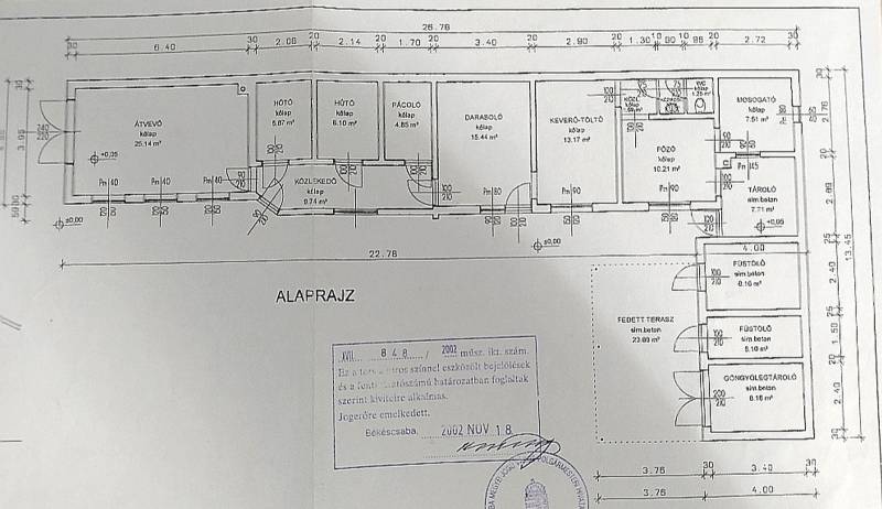Békéscsabán, az Orosházi úton eladó egy 2002-ben téglából épült 140nm-es volt húsfeldolgozó, amely 357 m²-es összközműves, ipari árammal ellátott (3X32A) osztott, külön bejáratú telken fekszik és jelenleg gazdasági épületként van nyilvántartva. A belső terében 60-as lefolyórendszer van kiépítve szinte minden helyiségben, kivéve az áruátvevőt, az udvaron zsírfogó akna található, és innen az utcáig 220-as lefolyórendszer vezet. A csatornarendszert tavaly teljes körűen kamerázták és tisztították meg. Minden helységben csúszásmentes hidegburkolat van, a falak pedig plafonig csempézettek. A közfalak eltávolíthatók, mivel a két szélső falak tartóelemek, így igény szerint még nagyobb tér alakítható ki. Az ingatlan ideális lehet szinte bármilyen vállalkozás számára, illetve raktározás céljára is. Gázóra külön, villany-víz almérővel rendelkezik. Társasház alapító okirat készítése folyamatban van. |