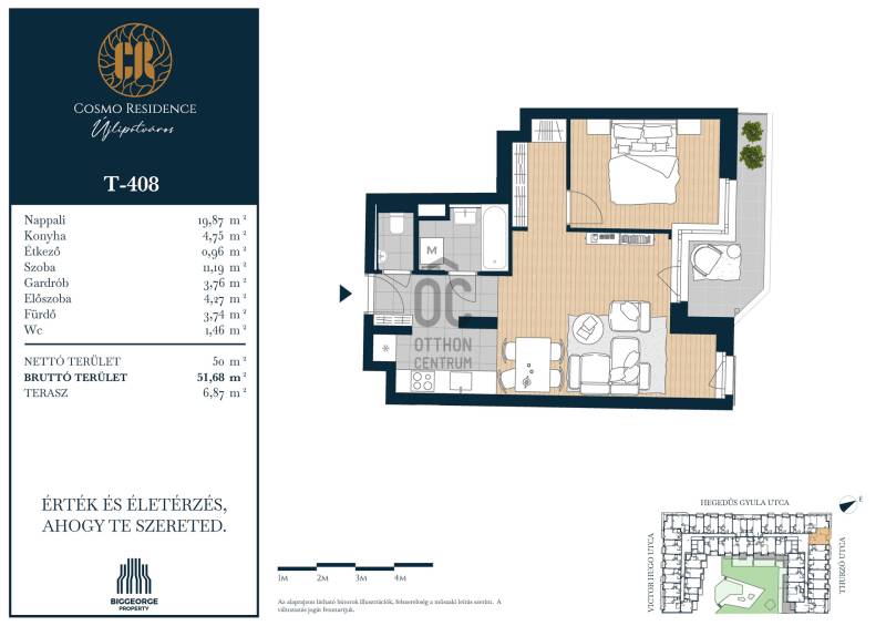 Projekt bemutatásaBudapest egyik legvonzóbb és legkeresettebb városrészében, Újlipótváros szívében egy új, exkluzív lakópark épül: az Cosmo Residence. A Hegedűs Gyula, Visegrádi, Victor Hugo és Thurzó utcák által körülhatárolt területen elhelyezkedő ingatlanfejlesztés a városrész ikonikus, nagypolgári hangulatát ötvözi, modern életstílussal, magas színvonalú építészeti megoldásokkal és első osztályú kényelemmel.A Cosmo Residence nemcsak egy újabb lakópark – hanem egy életstílus, amely a belvárosi pezsgést és a nyugodt, zöld környezetet egyaránt biztosítja lakóinak. Az ingatlan 2027. első felére készül el, és összesen 230 változatos méretű és elrendezésű lakást kínál, a 32 m2-es stúdiólakásoktól kezdve egészen a tágas, 125 m2-es, nappali + három hálószobás lakásokig. A legtöbb lakás erkéllyel rendelkezik, a legfelső szinten pedig exkluzív penthouse lakások várják azokat, akik a privát tetőterasz nyújtotta különleges panorámát szeretnék élvezni.A lakások tervezésekor több mint 4000 vevői visszajelzést vettünk figyelembe, így a terek és elrendezések maximálisan alkalmazkodnak a mai modern élet igényeihez. A belső kialakítások során lehetőség van egyedi igények figyelembevételére is, amit belsőépítészeti kollekciók segítenek. A 8 szintes épületben változatos méretű üzlethelyiségek is kialakításra kerülnek, melyek a földszinten kapnak helyet, további kényelmet biztosítva a lakók számára.A Biggeorge Property legújabb fejlesztése, a Cosmo Residence Budapest 13. kerületének közkedvelt helyszínén, Újlipótváros szívében épül, a Hegedűs Gyula, Visegrádi, Victor Hugo és Thurzó utca által határolt területen. A környék hangulatát tükröző épület 230 energiahatékony otthont kínál, amelyek megfelelnek a legújabb környezettudatos elvárásoknak. A fejlesztés részeként üzletek, tárolók és gépkocsi-beállók is kialakításra kerülnek, amelyek tovább növelik az épület lakóinak kényelmét. |