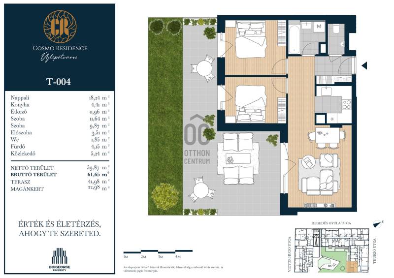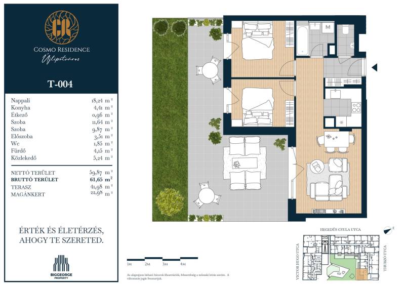Projekt bemutatásaBudapest egyik legvonzóbb és legkeresettebb városrészében, Újlipótváros szívében egy új, exkluzív lakópark épül: az Cosmo Residence. A Hegedűs Gyula, Visegrádi, Victor Hugo és Thurzó utcák által körülhatárolt területen elhelyezkedő ingatlanfejlesztés a városrész ikonikus, nagypolgári hangulatát ötvözi, modern életstílussal, magas színvonalú építészeti megoldásokkal és első osztályú kényelemmel.A Cosmo Residence nemcsak egy újabb lakópark – hanem egy életstílus, amely a belvárosi pezsgést és a nyugodt, zöld környezetet egyaránt biztosítja lakóinak. Az ingatlan 2027. első felére készül el, és összesen 230 változatos méretű és elrendezésű lakást kínál, a 32 m2-es stúdiólakásoktól kezdve egészen a tágas, 125 m2-es, nappali + három hálószobás lakásokig. A legtöbb lakás erkéllyel rendelkezik, a legfelső szinten pedig exkluzív penthouse lakások várják azokat, akik a privát tetőterasz nyújtotta különleges panorámát szeretnék élvezni.A lakások tervezésekor több mint 4000 vevői visszajelzést vettünk figyelembe, így a terek és elrendezések maximálisan alkalmazkodnak a mai modern élet igényeihez. A belső kialakítások során lehetőség van egyedi igények figyelembevételére is, amit belsőépítészeti kollekciók segítenek. A 8 szintes épületben változatos méretű üzlethelyiségek is kialakításra kerülnek, melyek a földszinten kapnak helyet, további kényelmet biztosítva a lakók számára.A Biggeorge Property legújabb fejlesztése, a Cosmo Residence Budapest 13. kerületének közkedvelt helyszínén, Újlipótváros szívében épül, a Hegedűs Gyula, Visegrádi, Victor Hugo és Thurzó utca által határolt területen. A környék hangulatát tükröző épület 230 energiahatékony otthont kínál, amelyek megfelelnek a legújabb környezettudatos elvárásoknak. A fejlesztés részeként üzletek, tárolók és gépkocsi-beállók is kialakításra kerülnek, amelyek tovább növelik az épület lakóinak kényelmét. |