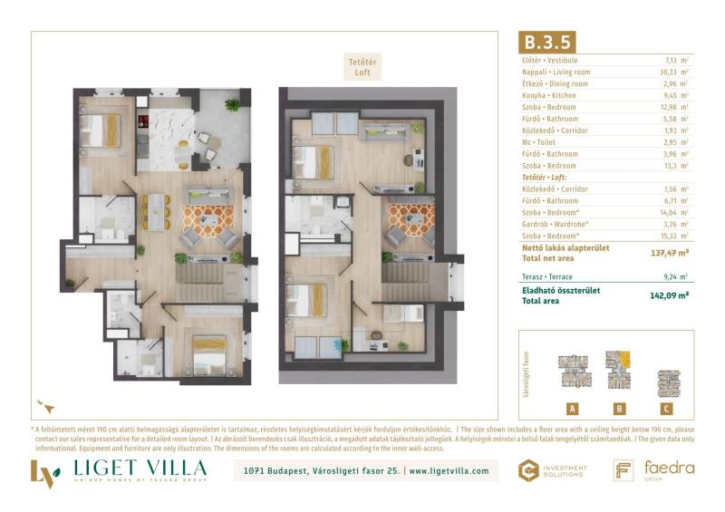 Projekt bemutatásaAki többre vágyik, mint egy átlagos lakópark, most hazaérkezett! Itt élni, itt lakástulajdonosnak lenni, egyet jelent a minőséggel.Az épületrőlA pesti diplomatanegyed legszebb utcájában épül, a megjelenésében, műszaki tartalmában és a lakáskínálata tekintetében egyaránt unikális, Liget Villa Lakópark. Az épületbe érve, egy elegáns lobby és recepcióra érkezünk majd. Innen a három épületet egy kerti úton, passzázs köti majd össze. A tervezés során nagy hangsúlyt kapott a családi igényekre tervezett lakás minőségi használhatósága. Ablakos konyhák, master bedroom-ok, dupla fürdőszobák, gardrób és háztartási helyiségek is helyet kapnak a lakásban. Kiemelten jól bútorzható, két irányba tájolt lakások kerülnek kialakításra. A földszinti lakásokhoz 50-100 m2-es privát kertek, míg a közös területeken tájépítész által tervezett reprezentatív kertet alakítunk ki. A lakásokban mennyezeti hűtés-fűtés biztosítja a téli-nyári kellemes komfortérzetet. A nyílászárók 3 rétegű üveggel, alu-fa kivitelben kerülnek beépítésre. A lakások ára tartalmazza alapárban az alu elektromos redőnyöket és okosotthon kiépítést is. Magas minőségű olasz és spanyol hidegburkolatválasztékban akár 60x60 cm-es lapok is válaszhatóak majd. A fa parketta és az átlag feletti minőség szaniterek, szintén alapárban válaszhatóak a lakásokba. Az épületek alatti mélygarázsban gépkocsibeállók és tárolók kerülnek kialakításra. A környékről:A környék közlekedése kiváló. 5 perc sétával elérhető a Andrássy úton a kisföldalatti. A szomszédos Balzac utcában és Dózsa György úton is számos buszjárat és troli is közlekedik. A város számos pontjára, akár átszállás nélkül is eljuthatunk. Ha pedig autóval közlekedünk, az M3 autópálya pár perc alatt elérhető. A Városligeti fasor két oldalán található szervízúton, parkolnia is lehet a Liget Villa Lakóparkba érkezőknek.Előnyök:A Liget Villa Lakpark lakásai, tökéletes választás azoknak, akik szeretnék élvezni a városi kényelmet anélkül, hogy lemondanának a természet közelségéről és a csendes életformáról. A belváros és a zöld liget is sétatávolságban elérhető. A gyerekek számára paradicsom a Városliget. Játszóterek, tó, sportpályák, állatkert, minden, amit egy gyerek csak kívánhat egy parkban. A közelben pedig a kultúrát és a sportos életformát kedvelők, egyaránt megtalálják a számukra fontos helyszíneket. Néprajzi, Szépművészeti, Mezőgazdasági múzeumok, a Magyar Zene Háza, a Műcsarnok mind-mind gazdag élményt nyújtanak az oda látogatóknak. A Városliget fasor pedig már önmagában egy oázis a városi környezetben. Hatalmas gesztenyefák, gyönyörű villaépületek, követségek, gimnázium, templom mellett sétálhatunk el nap mint nap. Ide nagyon jó lesz minden nap hazajönni. |