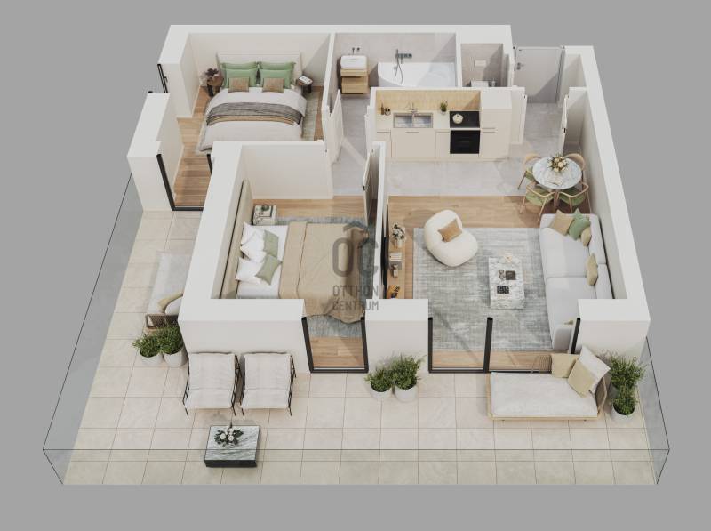 Projekt bemutatásaÉPÜLETSZERKEZETEK, KÖZPONTI GÉPÉSZET, ELEKTROMOSSÁG AlapozásPontalapozás és 25 cm vtg. vasbeton lemezalappal készülő szerkezet.Teherhordó vázszerkezetAz épületek hagyományos építési módban kerülnek kivitelezésre, monolit vasbeton vázszerkezettel, statikailagméretezett monolit vasbeton födémekkel, kitöltő kerámia és pórusbeton falakkal.FalakA pincefalak, a lépcsőházak és liftaknák körítő falai, valamint a szükséges merevítő falak vasbetonból készülnek. A külsőtérelhatároló falak Porotherm® vázkerámia és Silka® pórusbeton vázkitöltő falazatok. Mind a téglafalazatok, mindvasbeton falak az előírt hőtechnikai méretezésnek megfelelő vastagságú Austrotherm®, ill. Knauf Insulation®hőszigetelő rendszerrel készülnek. Az épületeken belüli lakáselválasztó falak hangtechnikai méretezésnek megfelelőnagyszilárdságú vázkerámia falazóblokkokból készülnek, a szükséges helyeken vasbeton pillérekkel, merevítő falakkal.A lakásokon belüli válaszfalak falazóblokkokból készülnek, a lakáselosztók szereléséhez Rigips® gipszkartonszerkezetű álmennyezet készül.FödémekA lakások területein alul, felül sík monolit vasbeton födémek készülnek rejtett gerendákkal, homlokzati síkonperemgerendákkal. A födémeken a lépés-hanggátlás biztosítására akusztikailag minősített szigetelésen úsztatottaljzatbeton készül, mely egyben a burkolatok fogadó szerkezete is.TetőfedésAz épületek fedése antracit színű Prefa® korcolt lemez fedéssel ellátott tetőfelületek.Külső nyílászárókAz Internorm® ablakok, tolóajtók és erkélyajtók külső oldalon antracit színű, alumínium vértezetű, belső oldalon fehérszínű, korszerű minimum Uw=1,0 W/m2K hőátbocsátási értékű, műanyag profilrendszerből készülnek, 3 rétegűhőszigetelő üvegezéssel, jó légzárással, továbbá akusztikailag megfelelő szerkezettel. A biztonságos és kényelmesszellőztetés biztosítása érdekében a műanyag nyílászáróval rendelkező lakásokban legalább egy nyílászárónrésszellőző elem kerül elhelyezésre. A műanyag homlokzati nyílászárók Schlotterer® redőnyszekrénnyel (redőny palástnélkül), illetve motoros mozgatás előkészítéssel a redőnyszekrényeknél elektromos kiállással (motor és távirányítónélkül) kerülnek beépítésre.Erkélyek, teraszokAz erkélyek csúszásmentesített fagyálló kerámia-, vagy gres járólappal, a teraszok csúszásmentesített fagyálló kerámiavagy gress járólappal burkoltak.Az erkélykorlátok rozsdamentes lakatos szerkezetűek, biztonsági üveg betéttel.Homlokzatok15 cm vastagságú homlokzati hőszigetelő rendszer. Mapei® rendszerű, kapart nemes vakolat felületképzés, fehérszínben, antracit nyílászáró parapet betétekkel. ÁlmennyezetA lakások egyes helyiségeiben (pl. előtér, WC, fürdő), valamint a közös területi közlekedőkben műszakiszükségességből Rigips® álmennyezet kerülhet kialakításra az elektromos és gépészeti vezetékek, berendezésektakarására.Liftek, közlekedőkÉpületenként 1db 8 személyes 630 kg teherbírású, Kleemann típusú személyfelvonó berendezés kerülbeépítésre.Esetleg még az elektromos részhez hozzá lehetne írni a felvonó elektromos betáplálása 3x20 A legfelső szinten afelvonó akna melletti részen kerüljön kiépítésre. Valamint EPH vezeték kiépítése szükséges felvonósüllyesztéki részében. A hőszigetelt belső térben lévő liftek előtere és a belső közlekedők csúszásmentes gresslap vagy kerámia burkolattalkészülnek.GarázsAz épületek alatt és az épületek közötti terület alatt, összefüggő teremgarázs kerül kialakításra. A teremgarázsokvakolatlan, nyers vasbeton falakkal és födémekkel, járófelületén felületkeményített beton burkolattal készülnek.ÉpületgépészetAz épületek teljesítik a 7/2006. TNM rendelet közel nulla energiaigényű épületekre vonatkozó követelményeit.A melegvíz ellátását lakásonként a fürdőszobában esztétikus kialakítással 100 l-es Ariston Velis Pro 100 EU designbojler biztosítja.A gépészeti csővezetékek eltakarva a felszállóaknában, álmennyezetben, ill. a betonfödémbe kerülnek elhelyezésre. Azalkalmazott csővezetékek, szénacélcső press idom technológiai kötéssel, ötrétegű műanyag cső víz- és fűtési vezeték,PVC és PE hangcsillapított lefolyóvezeték és acéllemez illetve PE légcsatorna.Helyi kisventilátorokkal biztosítjuk a fürdőszobák és a WC helyiségek légcseréjét, kivételt képez, ahol természetesszellőzés megoldható ablakon keresztül. A konyhában d125-ös méretű szellőzőcső a falsíkig épül meg, ide vanlehetőség csatlakoztatni a szagelszívót. A szellőzőcső a lapostető fölé kerül kivezetésre.A földszint közlekedői, garázsterei gépi szellőzés nélküliek, a tárolók és a gépészeti helyiségek szellőzése a tárolóajtókon keresztüli gravitációs szellőzéssel megoldott.Az épületek vízigényét a külső közműről önálló bekötés biztosítja. Az épületen belül a szennyvíz és a csapadékvízelvezetése szétválasztott hálózaton történik.A lakások fűtése és hűtése a folyamatos tartózkodásra szolgáló helyiségekben padlófűtési és fan-coil hűtési rendszerrelvalósul meg. A szükséges hőenergiát 2db központi gépészeti helyiségben kaszkád kapcsolásban üzemelő Daikin levegő-víz hőszivattyúk alkalmazásával állítjuk elő.A gépészeti helyiségekben kerülnek elhelyezésre a további szükséges szerelvények, puffer tárolók és keringetőszivattyúk.ElektromosságA felszín feletti elektromos hálózat (lakásokon belüli is) födémszerkezetben, falban, aknában, álmennyezeti térben,valamint padlóbetonban szerelt védőcsövekbe húzott vezetékekkel készül. Az épület t