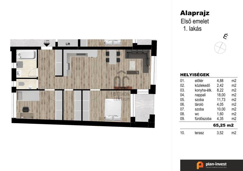 Ez az ingatlan az 1. emeleten helyezkedik el, 65 m2 alapterületű + 4 m2 erkély tartozik hozzá.Konyha - étkező - nappali + 2 szobá, külön fürdő, wc - s kialakítású.Projekt bemutatásaDebrecen belvárosában a Nagyállomás - Piacz utcához közel, de mégis a város csendes részén épül egy 6 lakásos társasház + 2 db iroda kialakítású társasház.Földszinten egy 33 m2 - es iroda + a gépkocsi parkolók kerülnek kialakításra, 1 - 2 - 3 emeleten szintenként 2 db lakás, + a 4. emeleten egy tetőtéri, nettó 70 m2 - es iroda kerül megépítésre.Lakások szintenkénti kiosztása, 1. - 2. - 3 . emeleten : : A : 65 m2 - es lakás + 4 m2 - es erkély , illetve : B : 47 m- es lakás + 3 m2 erkély, tehát egy szinten 2 db lakás lesz.Ezek az ingatlanok saját helyrajzi számmal rendelkeznek !!Várható átadás : előreláthatólag : 2026. év végeJellemzői :- liftes társasház- magas műszaki tartalom- megbízható, korrekt kivitelező/beruházó- hőszivattyús fűtés, padló hőleadóval- klíma vagy fan coil hűtés- élhető, jó lakás kialakítások- modern technológival épül- modern belső kialakítás - stb....Az ingatlanhoz fedett parkolót lehet vásárolni, ára : 8 - 12 MftHa felkeltettem az érdeklődését, kérem hívjon bizalommal. |