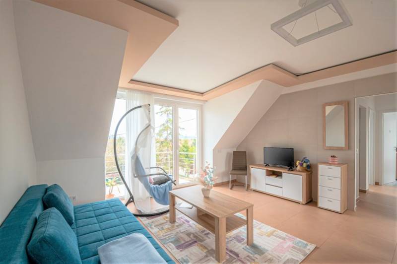Kiváló befektetés 900 méterre a Balaton legjobbnak választott strandjától! 4 lakásból álló apartman ház földszinti és tetőtéri lakásai külön-külön vagy egyben céggel együtt is eladók.A földszinti lakás: 68,07 m2 + 61,56 m2 terasz fele + 1 felszíni gépkocsibeálló. Ára: 104,99 millió Ft.A tetőtéri lakás: 63,87 m2 + 4,23 m2 erkély + 4,20 m2 tároló + 4,28 m2 erkély fele. + 1 felszíni gépkocsibeálló.Az épület 2022-ben épült korszerű építőanyagok felhasználásával. Lakásonként 1-1 db. kondenzációs, kombi gázcirkó biztosítja a radiátoros és padlófűtést valamint a meleg víz ellátást. A hűtést 3,5 KW-os, inverteres, hűtő-fűtő klímák biztosítják lakásonként. 3 rétegű, hő- és hangszigetelt, aranytölgy színű műanyag, homlokzati nyílászárók, redőnyök. Minőségi burkolatok, szaniterek, beépített bútorok, gépek és egyéb belsőépítészeti megoldások.Közös, parkosított 667 m2-es telek. Lakásonkét akár 2-2 db. gépkocsival is meg lehet állni a telken belül. Az ingatlanokat csak irodánk kínálatában találja. Hívjon bizalommal! |