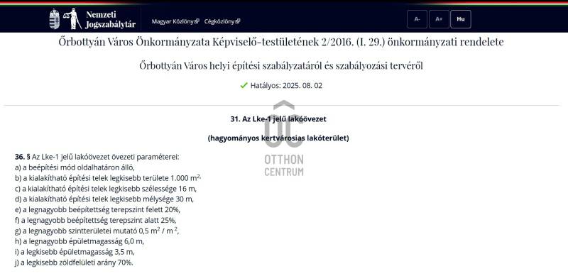 ŐRBOTTYÁN HAMAROSAN MEGÉPÜLŐ ÚJ VÁROSKÖZPONTJÁNAK KÖZELÉBEN, NAGY ÉRTÉKŰ CSALÁDI HÁZAKKAL / IKERHÁZAKKAL FOLYAMATOSAN BEÉPÜLŐ, CSENDES, NYUGODT ÉS ÁTMENŐ FORGALOMTÓL MENTES, ASZFALTOZOTT (ZSÁK)UTCÁJÁBAN, LKE-1-ES JELÖLÉSŰ (HAGYOMÁNYOS KERTVÁROSIAS LAKÓTERÜLET) ÉPÍTÉSI ÖVEZETBE TARTOZÓ, BELTERÜLETI, 1000 M2 ALAPTERÜLETŰ, DÉLNYUGATI TÁJOLÁSÚ, ÖSSZKÖZMŰVES (A TELKEN BELÜL VILLANY-, GÁZ-, VEZETÉKES VÍZ ÉS CSATORNA BEKÖTÉSSEL IS MÁR RENDELKEZŐ(!!!), CSALÁDI HÁZ VAGY IKERHÁZ ÉPÍTÉSÉRE IS KIVÁLÓAN ALKALMAS, ÖRÖK PANORÁMÁS, ENYHÉN LEJTŐS ÉPÍTÉSI TELEK ELADÓ !!!Az eladó telek főbb paraméterei:A telek építési övezet besorolása: Lke-1 (Hagyományos kertvárosias lakóterület)A telek beépítési módja: Oldalhatáron álló beépítési módA telek pozíciója: közbenső (nem saroktelek)A telek mérete: 1000 m2A telek utcafronti hossza (szélessége): 20 méterA telek utcafrontra merőleges hossza (mélysége): 50 méterA telek lejtése: enyhén lejtős (kb. 6%-os szintemelkedés – kb.: 3 méter / 50 méter)A telek fekvése / tájolása: DélnyugatiA telek panorámája: zöld környezetre / részben új építésű családi házakra néző örök panorámaA telek tereprendezettsége: Az őshonos növényzettől forgókotró géppel már teljesen kitisztított és folyamatosan karbantartottA telek közmű ellátottsága: Összközműves (!!!)- Vezetékes víz (kiépített vízóra aknával): a telekhatáron belül- Csatorna: a telekhatáron belül- Gáz (gázcsonk): a telekhatáron belül- Villany (3 fázis, 2 mérőórának helyet adó dobozzal): a telekhatáron belülŐrbottyán helyi építési szabályzata szerint az Lke-1 jelölésű építési telekre létesíthető építmény(ek)re vonatkozó további kötelező előírások:- A telekre építhető ingatlan jellege: önálló családi ház vagy ikerház- A telek legnagyobb beépíthetősége terepszint felett: 20%- A telek legnagyobb beépíthetősége terepszint alatt: 25%- A telken lévő legkisebb zöldfelületi arány: 70%- A legnagyobb kialakítható épületmagasság: 6 méter- A legkisebb kialakítható épületmagasság: 3,5 méter- A legnagyobb szintterületi mutató (m2/m2): 0,5Az építési telek önálló helyrajzi számon nyilvántartott, rendezett tulajdonjoggal és teljes tehermentességgel rendelkezik !!!További kedvcsinálónak pár mondatban Őrbottyán városáról: Pest vármegyében, a fővárosi agglomeráció külső övezetében, Budapest központjától mindössze 30 km-re északkeletre (gépjárművel M3-as autópályán megközelítve kb. 25-30 percnyire, vonattal a Nyugati pályaudvartól kb. 45-50 percnyire, távolsági Volán buszjárattal Újpest - Városkapu metrómegállótól kb. 1 órányira), a Cserhát hegység nyugati részéhez tartozó Gödöllői-dombság vonulatában, Erdőkertes és Csomád településnek, valamint Veresegyház városának szomszédságában elhelyezkedik el.Főleg a kisgyermekes családoknak fontos információ, hogy a telektől mindösszesen csak pár perc kényelmes sétatávolságra bölcsőde, óvoda és általános iskola is megtalálható, valamint a tömegközlekedés szempontjából a legközelebbi buszmegálló is szintén pár perc sétatávolságra van, de a vasútállomás is mindösszesen 10 perc kényelmes sétával könnyedén elérhető!A telek közelében épül fel Őrbottyán új városközpontja is, amely így tovább növeli majd a jövőben ennek az ingatlan az értékét!Ha a leírtak alapján felkeltettem az érdeklődését, megelőlegezett bizalmát előre is megköszönve, akár a hétvégén is várom szíves jelentkezését! |