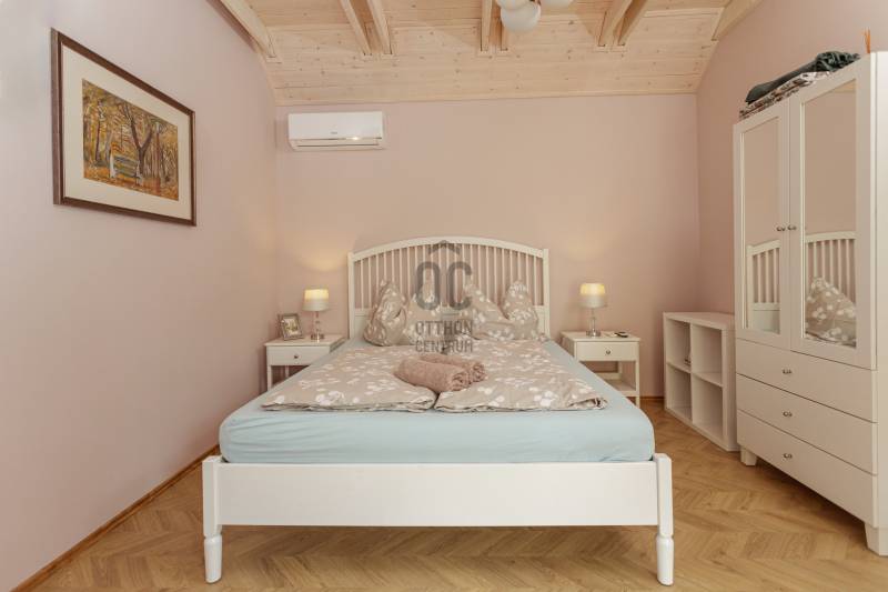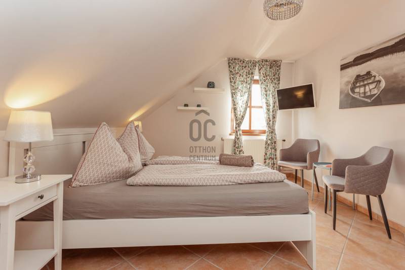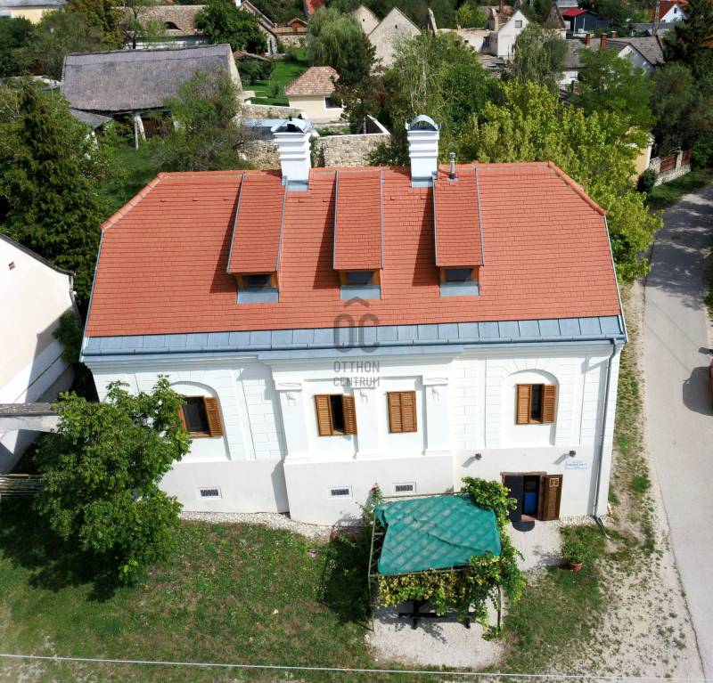 Köveskál a Balaton-felvidéken, a Káli-medence keleti részén található, a Balaton partjától körülbelül 7 kilométerre északra. Ma egyre inkább kedvelt a kerékpáros és más turisták körében, mivel a Káli-medence természeti szépsége és nyugalma rabul ejti az ide látogatókat.A Káli-medence a korábbi évszázadokban vízben gazdag volt, az itt átfolyó patakokon számos vízimalom üzemelt. Az átfolyó patakokon un. mosóházakat építettek. Egy ilyen található szépen helyreállítva Köveskálon is a Vásár téren, vele szemben pedig a régi bíróság és börtön épülete, melyet egy gyönyörűen felújított panzióként kínálunk most eladásra.Az épület több, mint 200 éves, csodálatos műemlék, napokig lehetne mesélni az épület történetét, a felújításának részleteit, az itt megélt sok száz év rezdüléseit..... De inkább érdemesebb élőben megtapasztalni, és akár egy éjszakára megszállni itt.A vendégházban összesen 7 különleges hangulatú szoba és egy lakosztály került kialakításra. A ház műszakilag is kifogástalan állapotú, fűtéséről gázkazán gondoskodik, hűtését pedig klíma berendezések szabályozzák. Minden közmű rendelkezésre áll a házban.Ajánlom az ingatlant mindazok figyelmébe,akik a \"béke szigetét\" keresik távol a mindennapoktól. A ház tökéletes nyaralónak, turisztikai befektetésként is vonzó lehet és állandó lakhatásra is alkalmas!\"A köveskáli Kelemen-ház, szerkezetének köszönhetően, egyedi példája Balaton-felvidéki házépítési gyakorlatnak. Az emeleti szint helyiségelrendezése visszaköszön az olyan épületeknél, mint a kapolcsi ú.n. Takács-kúria, az azonban, hogy pince szolgáljon alépítményéül kevéssé ismert. E sajátossága miatt a ház magas fokú ritkaságértékkel rendelkezik. Az épületszerkezetet tekintve magas esztétikai minőségű épület, magas esztétikai minőségű belső térrel, aminek fontos összetevői a boltozott terek sokasága, amely a technikai, építőmesteri tudás magasabb szintjét igényelve, a minőségi építészet jegyével ruházza fel az épületet. Emeletes megjelenésével nagyfokú reprezentatív értéke van, látványban felülmúlva az utcasorba betagolódó, a településképbe belesimuló falusi lakóházakét.\" (Balazsik Tamás, művészettörténész-régész értékvizsgálatából) |
