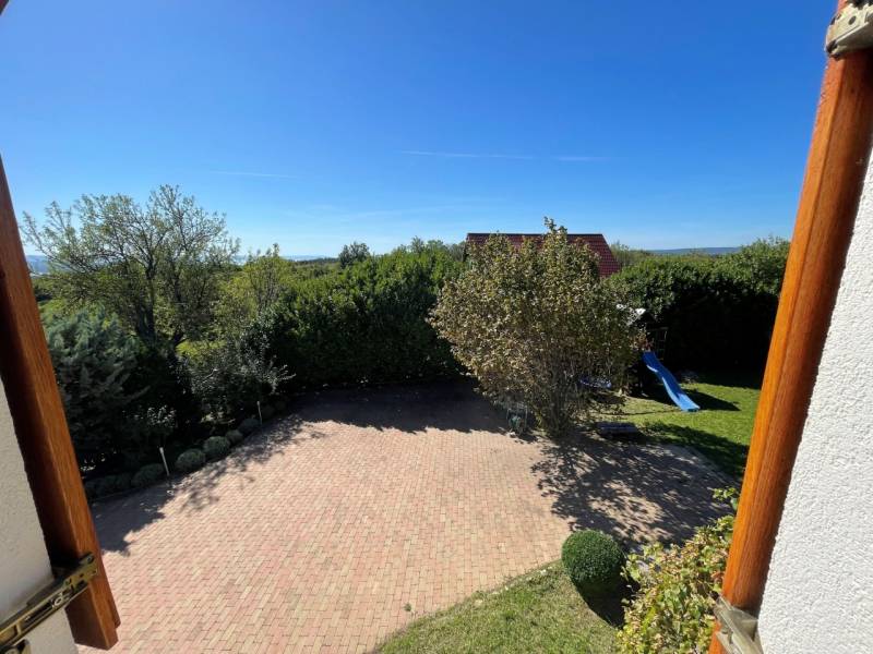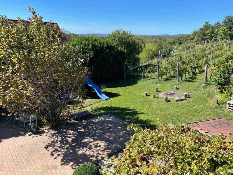 Panorámás szőlőhegyi ház Balatonfüreden – borospince, terasz, nagy telek!Balatonfüred csendes szőlőhegyi részén, 1868 m²-es telken eladó egy 158 m²-es kitűnő állapotú, igényes, Tihanyra néző panorámás ház téglaboltozatos borospincével, tágas terasszal, modern gépészettel és gondozott szőlővel. Az ingatlan Balaton-felvidék hagyományos stílusát és a kortárs építészet kifinomultságát ötvözi.Természetes, nemes anyagokból, helyi mesterek munkájával készült, így minden részlete a minőséget és tartósságot tükrözi.A ház a Balatonra nyíló panorámával és a természet nyugalmával ajándékoz meg, miközben Balatonfüred pezsgő élete néhány perc alatt elérhető.Főbb adatokHelyszín: Balatonfüred, szőlő besorolású telekTelek mérete: 1868 m² (gondozott szőlővel, díszkerttel, csúszdás mászókával, tágas parkolóval)Épület bruttó alapterülete: 158 m²Pince + földszint + tetőtér + borospince padlófűtés, extra radiátorok, sütőfunkciós cserépkályha, napkollektor – energiatakarékos kivitelPanorámás elhelyezkedés, természetvédelmi övezet mellettAz épületL-alakú, több szinten kialakított ház, tető- és homlokzatszigeteléssel, kettős hódfarkú betoncseréppel fedveTeljes alápincézés: tárolóhelyiség, infraszaunás, padlófűtéses fürdőhelyiség, gépészeti helyiségBorospince: földdel fedett téglaboltozatos, külön szellőzőkkel, tölgyfa ajtókkal, felülvilágítássalFöldszint: nappali + étkező (19,8 m²) + konyha (7,2 m² ) légtérben split klímával, vendégszoba (8,9 m²) + zuhanyzós fürdő (2,4 m²)Emelet: 2 hálószoba (20 és 10,2 m²) split klímákkal, sarokkádas fürdő (4,1 m²), külön WC (1,6 m²), tárolóKiegészítők: cserépkályha, infraszauna, félköríves terasz (25 m²), melynek burkolata felújításra szorul, így lehetőséget biztosítva a további egyéni igények kialakítására.Felszereltség és extrákViessmann gépészet: a tetőn elhelyezett napcellákkal a 705 l szünetmentes tápegységgel kiegészített puffertároló egész nyáron melegvizet, télen fűtésrásegítés funkciót biztosít.Fűtés: a föld alatti 5 m3-es propángáz tartály biztosítja a padlófűtést minden szinten, a nappaliban cserépkályha sütőfunkcióval, split klímák, a fürdőkben plusz törölközőszárító radiátorok.Nyílászárók: spalettás hőszigetelt tölgyfaablakok, mozgás-nyitásérzékelő riasztórendszerrel, kamerákkal.Szennyvíz: földalatti zárt szippantós.Kapcsolatok: meglévő UPC tányér és bevezetett telefonkábel, WIFI Extra: cserépkályha és infraszauna.Kert és telekTérkövezett parkoló, akár 5-6 autó részére1868 m² telek, melynek 80%-a gondozott szőlő (rizling, muskotály, csemegeszőlők)Vadkerítés, elektromos úszókapu, nagy parkoló világítássalCsepegtetőrendszer a díszkerthez, a szőlőben mozgásérzékelő reflektorok Játszótér: fa mászóka, csúszda, dupla hintaKerti tároló.ÁllapotÚjszerű, megkímélt állapotFolyamatosan karbantartvaEz az ingatlan tökéletes választás mindazoknak, akik Balatonfüreden keresnek nyugodt, panorámás környezetben épült, hivatalosan és szabályosan megépített gazdasági épületet, pince- és borospince-kapcsolattal, teljes infrastruktúrával, energiatakarékos gépészettel. |