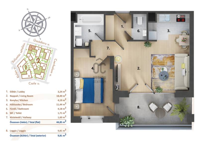 A XIII. kerület legnépszerűbb lakónegyedében, a Marina parton, a Duna Terasz Grande második épületében keresi új tulajdonosát egy amerikai konyhás nappali + hálószobás, 9,81 m2-es loggia-val rendelkező napfényes lakás! Ha érdekes lehet Önnek a Foka öböl közelében található, a modern életstílust az otthonos, családias hangulattal ötvöző ingatlan, akár befektetési célból akár saját célra, akkor ezt feltétlenül nézze meg!MIÉRT IDEÁLIS A LAKÁS?- 1. emeleti, 44,85 m2-es, 2 szobás, 9,81 m2-es loggia-val rendelkező ingatlan.- Felosztása: előtér, amerikai konyhás nappali és étkező, hálószoba, fürdőszoba, WC, erkély.- Kialakítása modern, elosztása logikus, a szobák tájolása nyugati.- A nappaliból és a hálószobából is van kijárat a nagy sarok erkélyre.- Magas minőségű és esztétikus anyagokkal, igényes burkolatokkal, prémium Laufen szaniterekkel, Hansgrohe csaptelepekkel készült.- A szobákat és az előteret laminált padlóval a fürdőszobát járólappal burkolták.- Nyílászáról műanyagok, ablakai hő és hangszigetelt 3 rétegű üveggel szereltek, az élettér világos.- Hőszivattyú által működtetett hálózat biztosítja, hogy a mennyezeti hűtés-fűtés, a legkevesebb energiafelhasználással az optimális hőfokot érje el.- Energetikai besorolása A++- A lakás egyedi hőmennyiség mérővel, vízórával, illetve elektromos mérőórával felszerelt.- A tervezett fűtési és hűtési költség (45 m2-es lakás esetén) kb. 10.000,-Ft/hó.- A lakásban okosotthon rendszer, videós kaputelefon és elektromos redőny előkészítés is van.- Az ingatlan könnyen kiadható, átlagosnál magasabb megtérülést biztosíthat.- A lakáshoz + 8,5 millió Ft-ért vásárolható egy normál méretű teremgarázs beálló hely.- A vételár tartalmazza az egyedileg készített konyhabútort háztartási gépekkel felszerelve, illetve a LED-es lámpatesteket minden helyiségben.AMIT A HÁZRÓL TUDNI KELL:- 2024-ben átadott, 5-9 szintes, 790 lakásos, tudatosan tervezett, letisztult épület.- A lakópark a modern városi élethez igazodó építészeti stílust képviselve kínál magas minőséget.- A társasház vasbeton monolit szerkezetű, 30 cm-es Porotherm téglából álló külső kitöltő falakkal és 15 cm-es dryvit szigeteléssel.- A lakásokat 30 cm-es Szilka tégla fal választja el.- A homlokzat és a lépcsőház modern vonalvezetésű, igényes megjelenésű.- A pinceszinten és a földszinten teremgarázs beállók és tárolók, valami modern liftek biztosítják a lakók kényelmét.- Műszaki tartalma magas minőségű, innovatív megoldásokkal és zöld energia felhasználással készült.- A társasház belső részén több kisebb parkosított, zöld belső kert került kialakításra.- A társasházban 0-24 Portaszolgálat és csomagpont is működik.KÖRNYÉK ÉS KÖZLEKEDÉS:- XIII. kerület, Vizafogó városrész, Marina part, Úszódaru utca.- Kiváló infrastruktúrával és tömegközlekedéssel rendelkező, folyamatosan fejlődő terület, természetközeli környezet.- A Gyöngyös utcai M3-as metrómegálló és a Duna Plaza, 5 perc sétatávolságra van.- A 15-ös busz megállója 50 m távolságra van, a 950-es és a 950A éjszakai buszjáratok 20 percenként közlekednek.- 500 méteren belül gyalogosan elérhető minden, ami a hétköznapokhoz szükséges.- Karnyújtásnyira van gyógyszertár, orvosi rendelő, edzőtermek, mozi, éttermek és szolgáltatók sokszínű választéka.- A lakóparkban közös jóga, napozó és grillterasz, játszótér, kültéri edzőterem lett kialakítva.- A közelben van hajókikötő, Duna parti sétány, kerékpárút, a Dagály fürdő, és az Aréna uszoda.- A nagyobb budapesti egyetemek tömegközlekedéssel maximum 15 perc alatt elérhetők.- Az autóval közlekedők a Váci úton érhetik el Buda és Pest főbb csomópontjait, valamint az M0-ás és M2-es autópályákat.- A környék kifejezetten vonzó a fiatalok és a kozmopolita életet kedvelők számára.FINANSZÍROZÁSBAN – ONLINE IS – SEGÍTÜNK!- Bankfüggetlen hitelcenterünk díjmentesen versenyezteti az összes bank és hitelintézet ajánlatát.- Önnek csak annyi a dolga, hogy egyeztet munkatársunkkal, majd kiválasztja a hosszú távon is legkedvezőbb konstrukciót.- Szakértőink 20 év tapasztalattal, fogyasztóbarát lakáshitelekkel, babaváró hitellel és teljes körű CSOK Plusz és OTTHON START program ügyintézéssel várják.- Időpont-egyeztetéssel munkaidő után is elérhetők.Ha valóban igényes és minőségi felújításon átesett, különleges lakást keres, jöjjön és nézzük meg együtt! EGYEDI LEHETŐSÉG, ne maradjon le róla!Érdeklődés esetén VÁROM HÍVÁSÁT a hét minden napján! |