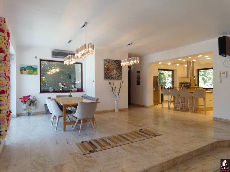 Kiadó Gödöllő Fenyves városrészén, a Fenyvesi Nagyúton egy 472 m2-es (425 m2 belső rész + az összesen 95 m2-nyi terasz és erkély fele), nappali + 6 szobás, ÚJSZERŰ CSALÁDI VILLA, egy 2.472 m2-es gyönyörű telken.Már az is lélegzetelállító, amikor a telekre belépünk. Hiszen a ház nagyságrendileg a hatalmas telek közepére épült, így amikor behajtunk a masszív, terméskő oszlopok között valódi kovácsoltvas elemekkel díszített kerítés, kétszárnyú elektromos KOVÁCSOLTVAS KAPU-ján keresztül, akkor kb. 1.000 m2-nyi ŐSFÁS, GONDOZOTT PARK tárul a szemünk elé, és emögött bújik meg diszkréten a pazar épület.A 2008-ban elkészült házban 3 szint épült: földszint (150 m2 + 58 m2 terasz), emelet (125 m2 + összesen 37 m2 es terasz és erkélyek) és az alagsor (150 m2).A FÖLDSZINTEN a dolgozó szobát és a wc helyiséget leszámítva minden egy légtérben van, azaz majdnem 120 m2-en kapott helyet a nappali, az étkező és a konyha. Mindez körben hatalmas üvegfelületekkel, illetve részben olyan eltolható ajtókkal, aminek köszönhetően össze nyithatjuk a teret a terasszal. ...és a terasz túloldalán csobbanhatunk a FŰTHETŐ MEDENCÉBE (1,5-2 méter mély, 75 m3-es).Az egész földszint, a fa gerendákkal díszített dolgozó szobával, illetve a lépcsőházzal együtt CSISZOLT ÉDESVÍZI MÉSZKŐ burkolatot kapott (travertin).A 120 m2-es közös tér köszönhetően a rengeteg üvegfelületnek, a 3,5 m-es belmagasságnak, a két lépcsőfoknyi szintkülönbségnek a nappali és az étkező között, illetve annak, hogy ebből a térből rálátunk a lépcsőház gyönyörűszép, valódi kovácsoltvas korlátjára, meglehetősen elegáns és modern hatást kelt.Az EMELETEN, a tetőtérben (belmagasság: 2,85 m) - a kontyolt nyeregtető alatt - találunk egy 25 m2-es szülői hálószobát saját fürdővel, saját gardróbbal és saját terasszal (21 m2). Ezen túl még 4 szoba (21 m2, 15 m2, 13 m2, 13 m2) hatalmas beépített szekrényekkel, és egy másik fürdőszoba is helyet kapott az emeleten, illetve még két nagyobb erkély (6 illetve 10 m2). A szülői hálóhoz tartozó fürdőszobában egy dupla férőhelyes jakuzzis fürdőkád van beépítve a tetőtéri ablakok alá, hogy este a csillagokban is gyönyörködhessen, és egy hidromasszázs zuhanykabin, dupla mosdó, wc, és bidé is található itt.A folyosóról nyíló fürdőszoba kádas, szintén dupla mosdós, és wc és bidé is helyet kapott.Egyetlen emeleti szobát kivéve mindegyik erkélykapcsolatos.Az ALAGSORI SZINTEN (belmagasság: 2,82 m) egy 90 m2-es egylégterű fitness és hobbi helyiségben a kondi gépek, a szauna a hozzátartozó zuhanyzóval, és a biliárdasztal kapott helyet. Ezen a szinten található a gépház a mosókonyhával egyben, egy tágas szárító helyiség, egy kis tároló és a BOROSPINCE is.A borospincén kívül az egész házban minden helyiségben PADLÓFŰTÉS van. Egy 55 kw-os ipari gázkazán fűt.A ház tetején napkollektorok kerültek elhelyezésre.Az épület 38 cm-es Porotherm téglából készült, és 15 cm-es szigetelést kapott.Minden szobában található egy Samsung hűtő-fűtő légkondi, a nappali helyiségben 2 darab is.Az ablakok és az ajtók egyedileg készültek fából, és fényvisszaverő fólia van rajtuk, ez nyáron gátolja a ház felmelegedését, és belátni sem lehet.A kamera- és a riasztórendszer is ki van építve.A házban több helyen hangulatfények, és egyéb dizájn világítás kapott helyet.A ház fűtésrendszere tavaly lett felújítva, a medencét újra fóliázták és a gépészetét kicserélték, a nyílászárókat újra lazúrozták, és a 4 beállásos nyitott gépkocsitároló is tavaly épült.A parkosított, locsolórendszerrel rendelkező kertben egy KIS TÓ csobogóval, tavirózsákkal, aranyhalakkal és egy SZÖKŐKÚT is található.6*32 Amper és ipari áram is van.A telken 2 db fúrt kút található.Kérésre küldök videót a házról.Hívjon, akár az esti órákban, akár hétvégén is! |