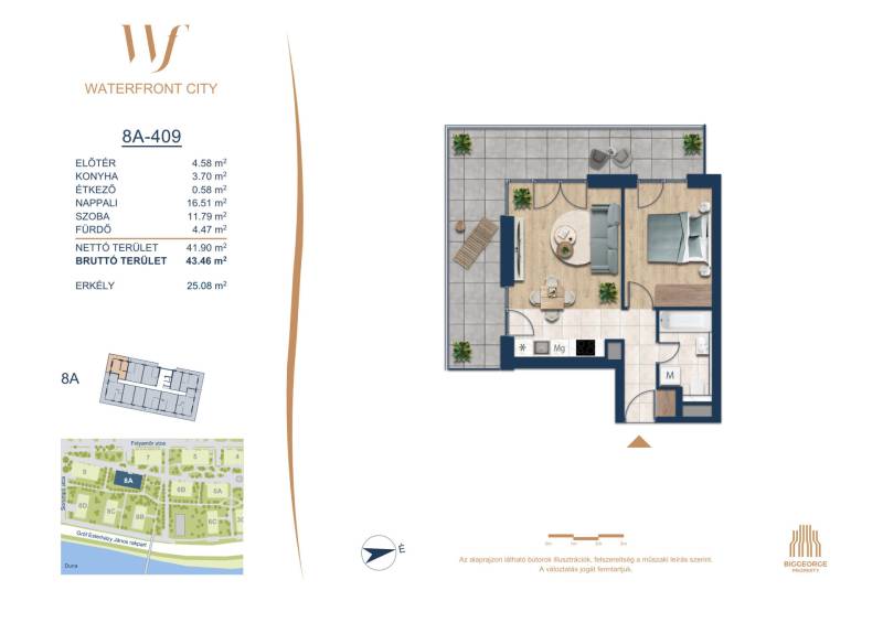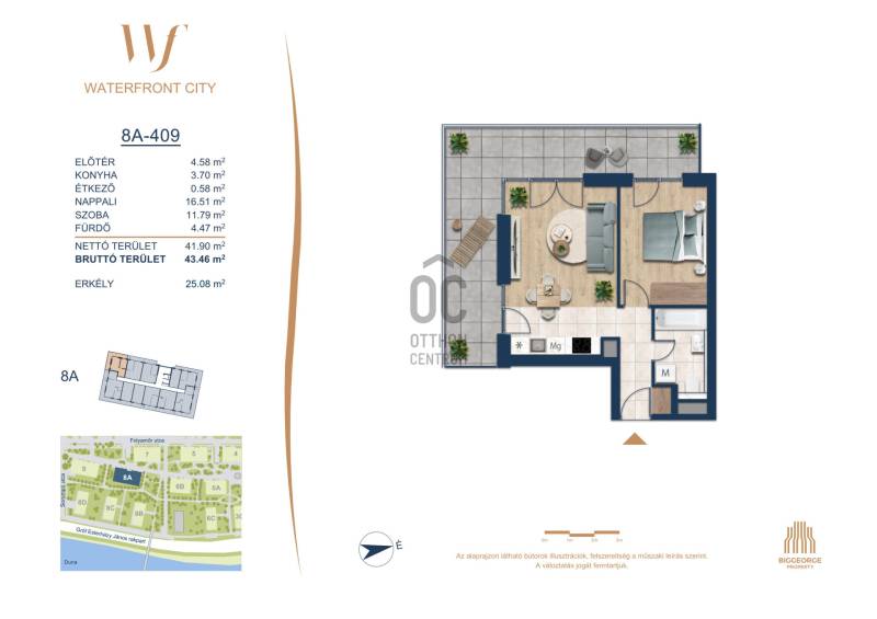 Projekt bemutatásaA projektrőlA Waterfront City egy új, modern városnegyed a 3. kerületben, ahol a természet közelsége és a városi kényelem tökéletes egyensúlyban van. A Duna-part közvetlen szomszédságában elhelyezkedő fejlesztés különleges atmoszférát kínál: a sétányt új épületek határolják, üzletekkel, kávézókkal és szolgáltatásokkal, amelyek élhető közösségi teret teremtenek.A 13 emeletes lakóépületből lenyűgöző örökpanoráma nyílik a budai hegyekre és a folyóra, a tágas teraszok pedig ideálisak a pihenéshez vagy a baráti összejövetelekhez. A zöldtetők, parkosított terek és fenntartható megoldások – mint az energiatakarékos rendszerek és okos otthon funkciók – mind hozzájárulnak a modern, környezettudatos életstílushoz.Látogass el értékesítési irodánkba, és tekintsd meg a városnegyed makettjét személyesen! Ismerd meg, milyen lesz az élet Budapest egyik legizgalmasabb új fejlesztésében!Óbuda szívébenKépzeld el, ahogy egy napsütéses délelőttön Óbuda szívében sétálsz, a Duna közelsége frissítően hat rád, miközben a Folyamőr utca, a Miklós tér és a Bogdáni út által határolt, öt hektáros területre érsz. A levegőben ott van a város történelme, mégis minden részletében a jövő hívogat.A 50 000 négyzetméteres területen egy hangulatos sétány vezet végig, amely egyenesen az óbudai Fő térre visz – mindössze 600 méterre. Ez a sétány nem csupán összeköt, hanem élményt nyújt: a Kolosy térről induló Óbudai Promenád részeként a város egyik legélhetőbb, legpezsgőbb szakaszán haladsz végig. És ha biciklivel érkeznél? A nemzetközi kerékpárút is itt halad el, Szentendre felé vezetve.Az 5. ütemben épülő 149 lakás mindegyike egyedi hangulatot kínál. Ahogy belépsz egy-egy otthonba, a hatalmas üvegfelületeken át beáradó fény és a tágas, szellős terek azonnal magukkal ragadnak. A kilátás? A Kaszap István park zöldje nyújt békét, míg a felsőbb emeletekről a Budai-hegység örökpanorámája tárul eléd – minden nap egy új festmény az ablakodban.A 6. ütemben 316 modern lakás épül, tágas teraszokkal és lenyűgöző kilátással a Dunára és a budai hegyekre. A lakók kényelmét őrszolgálat, kamerarendszer, mélygarázs, vendéglátóhelyek, belső park, játszótér és E-autó töltők szolgálják. Ez a projekt utolsó üteme, amely még közvetlen Duna-parti kapcsolattal rendelkezik. |