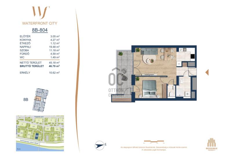 Projekt bemutatásaA projektrőlA Waterfront City egy új, modern városnegyed a 3. kerületben, ahol a természet közelsége és a városi kényelem tökéletes egyensúlyban van. A Duna-part közvetlen szomszédságában elhelyezkedő fejlesztés különleges atmoszférát kínál: a sétányt új épületek határolják, üzletekkel, kávézókkal és szolgáltatásokkal, amelyek élhető közösségi teret teremtenek.A 13 emeletes lakóépületből lenyűgöző örökpanoráma nyílik a budai hegyekre és a folyóra, a tágas teraszok pedig ideálisak a pihenéshez vagy a baráti összejövetelekhez. A zöldtetők, parkosított terek és fenntartható megoldások – mint az energiatakarékos rendszerek és okos otthon funkciók – mind hozzájárulnak a modern, környezettudatos életstílushoz.Látogass el értékesítési irodánkba, és tekintsd meg a városnegyed makettjét személyesen! Ismerd meg, milyen lesz az élet Budapest egyik legizgalmasabb új fejlesztésében!Óbuda szívébenKépzeld el, ahogy egy napsütéses délelőttön Óbuda szívében sétálsz, a Duna közelsége frissítően hat rád, miközben a Folyamőr utca, a Miklós tér és a Bogdáni út által határolt, öt hektáros területre érsz. A levegőben ott van a város történelme, mégis minden részletében a jövő hívogat.A 50 000 négyzetméteres területen egy hangulatos sétány vezet végig, amely egyenesen az óbudai Fő térre visz – mindössze 600 méterre. Ez a sétány nem csupán összeköt, hanem élményt nyújt: a Kolosy térről induló Óbudai Promenád részeként a város egyik legélhetőbb, legpezsgőbb szakaszán haladsz végig. És ha biciklivel érkeznél? A nemzetközi kerékpárút is itt halad el, Szentendre felé vezetve.Az 5. ütemben épülő 149 lakás mindegyike egyedi hangulatot kínál. Ahogy belépsz egy-egy otthonba, a hatalmas üvegfelületeken át beáradó fény és a tágas, szellős terek azonnal magukkal ragadnak. A kilátás? A Kaszap István park zöldje nyújt békét, míg a felsőbb emeletekről a Budai-hegység örökpanorámája tárul eléd – minden nap egy új festmény az ablakodban.A 6. ütemben 316 modern lakás épül, tágas teraszokkal és lenyűgöző kilátással a Dunára és a budai hegyekre. A lakók kényelmét őrszolgálat, kamerarendszer, mélygarázs, vendéglátóhelyek, belső park, játszótér és E-autó töltők szolgálják. Ez a projekt utolsó üteme, amely még közvetlen Duna-parti kapcsolattal rendelkezik. |