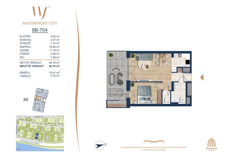 Projekt bemutatásaA projektrőlA Waterfront City egy új, modern városnegyed a 3. kerületben, ahol a természet közelsége és a városi kényelem tökéletes egyensúlyban van. A Duna-part közvetlen szomszédságában elhelyezkedő fejlesztés különleges atmoszférát kínál: a sétányt új épületek határolják, üzletekkel, kávézókkal és szolgáltatásokkal, amelyek élhető közösségi teret teremtenek.A 13 emeletes lakóépületből lenyűgöző örökpanoráma nyílik a budai hegyekre és a folyóra, a tágas teraszok pedig ideálisak a pihenéshez vagy a baráti összejövetelekhez. A zöldtetők, parkosított terek és fenntartható megoldások – mint az energiatakarékos rendszerek és okos otthon funkciók – mind hozzájárulnak a modern, környezettudatos életstílushoz.Látogass el értékesítési irodánkba, és tekintsd meg a városnegyed makettjét személyesen! Ismerd meg, milyen lesz az élet Budapest egyik legizgalmasabb új fejlesztésében!Óbuda szívébenKépzeld el, ahogy egy napsütéses délelőttön Óbuda szívében sétálsz, a Duna közelsége frissítően hat rád, miközben a Folyamőr utca, a Miklós tér és a Bogdáni út által határolt, öt hektáros területre érsz. A levegőben ott van a város történelme, mégis minden részletében a jövő hívogat.A 50 000 négyzetméteres területen egy hangulatos sétány vezet végig, amely egyenesen az óbudai Fő térre visz – mindössze 600 méterre. Ez a sétány nem csupán összeköt, hanem élményt nyújt: a Kolosy térről induló Óbudai Promenád részeként a város egyik legélhetőbb, legpezsgőbb szakaszán haladsz végig. És ha biciklivel érkeznél? A nemzetközi kerékpárút is itt halad el, Szentendre felé vezetve.Az 5. ütemben épülő 149 lakás mindegyike egyedi hangulatot kínál. Ahogy belépsz egy-egy otthonba, a hatalmas üvegfelületeken át beáradó fény és a tágas, szellős terek azonnal magukkal ragadnak. A kilátás? A Kaszap István park zöldje nyújt békét, míg a felsőbb emeletekről a Budai-hegység örökpanorámája tárul eléd – minden nap egy új festmény az ablakodban.A 6. ütemben 316 modern lakás épül, tágas teraszokkal és lenyűgöző kilátással a Dunára és a budai hegyekre. A lakók kényelmét őrszolgálat, kamerarendszer, mélygarázs, vendéglátóhelyek, belső park, játszótér és E-autó töltők szolgálják. Ez a projekt utolsó üteme, amely még közvetlen Duna-parti kapcsolattal rendelkezik. |