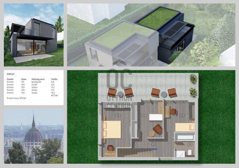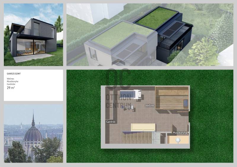 Fedezze fel ezt a kivételes adottságú, luxusminőségben kivitelezett, örökpanorámás otthont, amely a hegyoldal csendjét és Budapest egyik legkeresettebb városrészének kényelmét ötvözi. A közel 190 m²-es lakás hatalmas teraszokkal, privát kerttel, opcionálisan kültéri medencével és igény esetén kialakítható tetőterasszal kínál modern, kényelmes és jövőálló életteretPrémium műszaki tartalom – A++ energiahatékonyság, jövőálló megoldásokAz ikerházfél tervezésekor a magas minőség, az energiahatékony működés és a kényelmes mindennapok biztosítása volt a fő szempont. A kivitelezés és a gépészet minden elemében a legmodernebb technológiákat vonultatja fel.Energetika és gépészet:-A++ energiahatékonyság-DAIKIN hőszivattyús hűtés–fűtés-Padlófűtés minden helyiségben-Helyiségenként távolról szabályozható termosztát-ZENDER hővisszanyerős, páraszabályozós szellőztető rendszer(pollen- és porszűrővel)-Központi porszívó rendszerSzerkezet és nyílászárók:-15 cm külső hőszigetelés-3 rétegű ALUPROF emelő-toló nyílászárók-Motoros fixscreen árnyékolók előkészítésOkosotthon és biztonság:-Okosotthon-előkészítés-Automata öntözőrendszer előkészítés-Riasztó- és kamerarendszer előkészítés-Okos ajtó távoli ujjlenyomat-vezérlésselMegjelenés és külső terek:-Egyedi, modern, letisztult homlokzati design-Nagyméretű, panorámás teraszok: 12 m², 27 m², 27,2 m²-Saját, 386 m²-es privát kert-Opcionálisan 3×7 m-es kültéri medenceLokáció – Zöldövezeti luxus a budai hegyek ölelésében:Az ikerházfél Budapest III. kerületének egyik legkedveltebb, nyugodt mellékutcájában található. A környék ideális azoknak, akik egyszerre szeretnének csendes, természetközeli környezetben élni, mégis közel maradni a városi infrastruktúrához.Környezeti és életmódbeli előnyök:Hegyvidéki, exkluzív, csendes környezetÖrökpanorámás kilátás – a környék sport- és zöldterületeire isKiváló levegőminőségNyugodt családi házas övezet, minimális forgalommalKözeli túra- és futóútvonalak, panorámás sétalehetőségekGolf, kerékpár, természetjárás – sportos életmódnak ideálisInfrastruktúra és közlekedés:Pár perc autóval a GOBUDA Mall, Stop Shop, Kolosy tér, Óbuda főtereGyors közlekedési kapcsolatok — autóval és tömegközlekedéssel isKözelben elérhető a British International School, így családok számára kiemelten kedvezőBölcsődék, óvodák, iskolák, orvosi rendelők, sportlétesítmények – minden könnyen elérhető--------------Az ikerházfél elrendezése – Funkcionális, háromszintes kialakítás:GARÁZS SZINT – 29 m²A ház praktikus kiszolgálószintje, amely tehermentesíti a lakótereket:-Wellness helyiség-Mosókonyha-Gardrób / tárolóTökéletes helyszín edzéshez, mosáshoz, szezonális tároláshoz és wellness funkciókhoz.FÖLDSZINT – 76,8 m² + 12 m² és 27 m² teraszokA földszint a közösségi élet tere – panorámás nappalival, fantasztikus kertkapcsolattal és nagy üvegfelületekkel.Innen nyílik a saját, 386 m²-es kert, ahol akár medence is kialakítható.Helyiségek:-Előtér (4,7 m²)-WC (1,8 m²)-Gardrób (5,1 m²)-Fürdő (4,4 m²)-Hálószoba (11,4 m²) – ideális vendég- vagy dolgozószoba-Amerikai konyhás nappali (49,4 m²) – közvetlen teraszkapcsolattalKét irányba is teraszok nyílnak, így a kert több funkcionális részre is tagolható: napozóterasz, kültéri étkező, pihenőkert vagy játszórész.EMELET – 47,7 m² + 27,2 m² teraszA felső szint a család privát élettere, csodás panorámával.Helyiségek:-Közlekedő (5,8 m²)-Fürdő (5,0 m²)-Szoba (15,2 m²)-Szoba (11,5 m²)-Szoba (10,2 m²)A hatalmas, panorámás terasz tökéletes a reggeli kávéhoz, napozáshoz vagy esti pihenéshez, és igény esetén akár tetőterasz továbbfejlesztése is megoldható.PARKOLÁS:2 db teremgarázshely(kötelezően megvásárolandó – 2 × 14 M Ft)Tervezett átadás: 2026 I. negyedév |