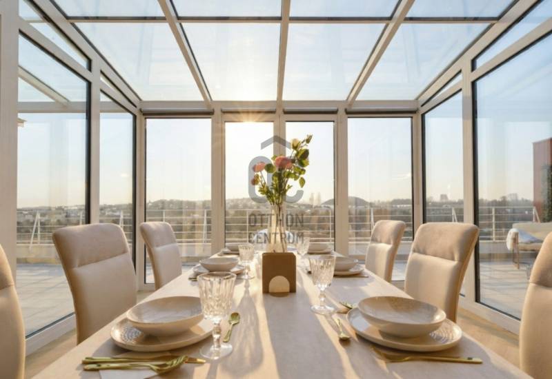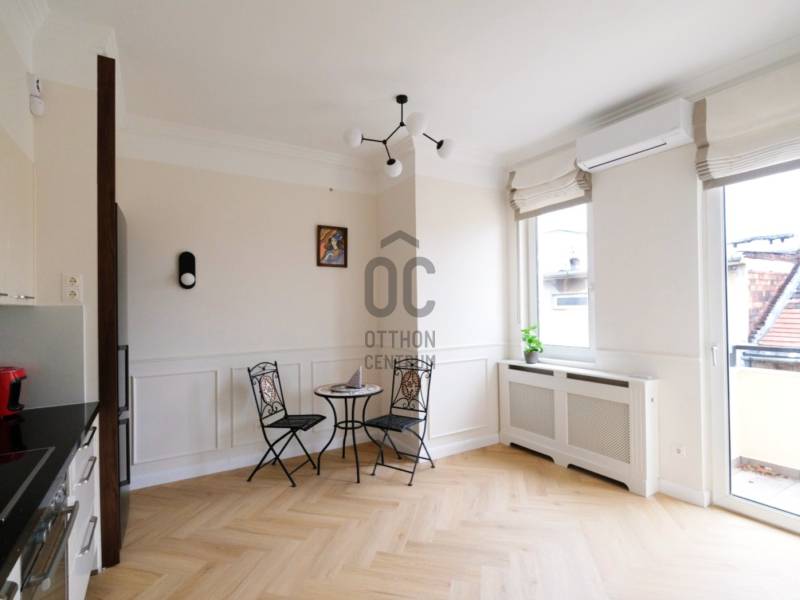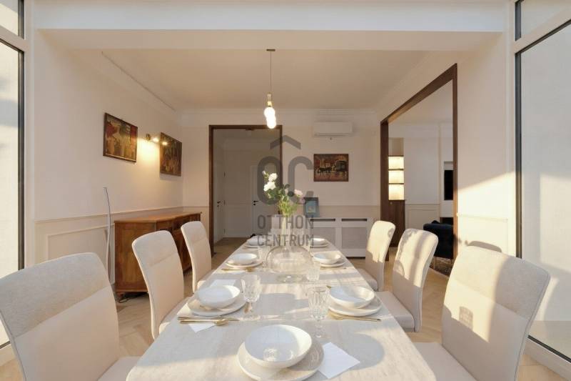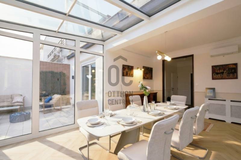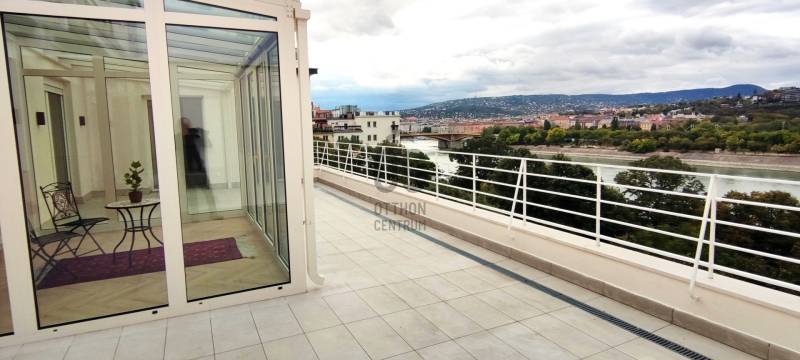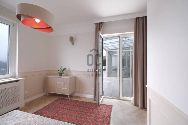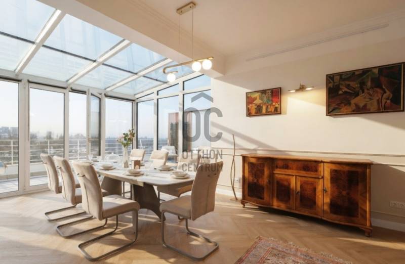 Penthouse a Szent István park felett – Margitsziget-panoráma, 50 m²-es tetőterasz, luxus Újlipótváros szívébenA 110 m²-es, belsőépítész által megálmodott otthon a kifinomult dizájn és a mindennapi kényelem kiegyensúlyozott elegyét kínálja. A lakás szíve az üvegfalú télikert-étkező, ahol télen-nyáron természetes fényben élvezheti a Dunára és a budai hegyekre nyíló kilátást.A tágas belső terek mellett hatalmas privát tetőterasz várja kültéri zuhannyal – ideális hely a város feletti pihenéshez. A lakásban 2 hálószoba, 2 fürdőszoba és egy nagy méretű nappali található, és válogatott prémium bútorokkal berendezett és gépesített. (A bútorok egy része a fotókon még nem látható.)– 110m² lakótér klimatizált üvegfalú télikert-étkezővel, 50m²-es tetőterasszal– Elsőrangú lokáció Újlipótvárosban a Pozsonyi út és a Szent István park mellett – Villamos: 4/6, trolibusz:75, 76, nem messze M3-as Metró, Nyugati Pu.-tol.– Örök panoráma a Szent István Parkra, a Margitszigetre és a budai hegyekre– Lifttel megközelíthető csendes legfelső szint - kerekesszékes használatra alkalmas– Prémium gépesítés, okostévé, okostelefonról vezérelhető klimatizálás és világítás– Távfelügyeletbe kötött riasztó, korszerű nyitás- és füstérzékelés– Parkolás közeli garázsban (bérlet része)– Otthonmenedzsment-asszisztencia (pl. tetőterasz ápolása) a bérlet része – takarítás igény szerintEz az ingatlan több mint lakás – életforma azoknak, akiknek fontos a tetőterasz és a télikert nyújtotta hangulat és a dunai horizont zavartalan látványa.Bérleti feltételekSzerződéskötéskor 2 havi kaució és 1 havi bérleti díj fizetendő.Minimum bérleti idő: 2026 július 31-igNemdohányzó ingatlan; szabadon mozgó kisállat nem hozhatóKözjegyzői okiratba foglalt kiköltözési nyilatkozatFelhívjuk figyelmét, hogy a képgaléria a lakás bútorozás előtti és utáni, berendezett állapotát is bemutatja, így a felvételek között eltérések tapasztalhatóak. |