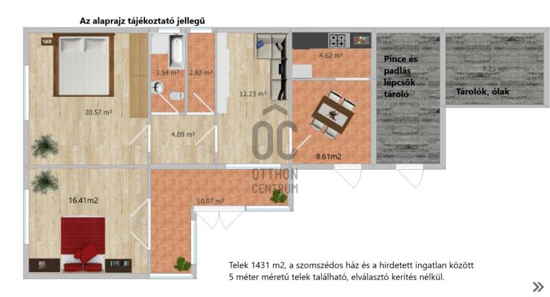 Úri községben került eladósorba az alábbi paraméterekkel rendelkező, karbantartott ingatlan!-1431 nm, összközműves, részben gyümölcsfákkal beültetett telekre épült - 82 nm lakóterületű, önálló ház, mely-1965. évben kapta meg jelenlegi formáját-falazata vegyes ( tégla- vályog), statikailag jó állapotú-cseréptetős, fafödémmel-jól karbantartott ingatlan, melyen az elmúlt pár évben felújítás/ korszerűsítés történt, újszerű a fürdő és a villanyvezetékek 3 éve lettek cserélve-fűtése konvektorokkal kivitelezett, melegvízellátása bojlerral megoldott-elosztása jelenleg 2 db nagy méretű ( 20.57nm, 16.41nm) szoba, étkező- nappali-konyha-fürdő, kamra, előszoba, veranda és számos tároló, jól alakítható épület amennyiben más elképzelése lenne-jelenleg autóval nem lehet beállni a telekre!-gyorsan birtokbavehetőA környék csendes, széles aszfaltos utcában helyezkedik el. A buszmegálló cirka 7 perc sétával elérhető. Óvoda- bölcsőde, művelődésiház, bevásárlási lehetőség szintén séta távolságra találhatóak.Jó szívvel ajánlom a nagy kertet igénylő, nyugalomra vágyó pároknak, akik szívesen alakítják saját ízlésükre.Ez a hirdetés az Otthon Centrum Felező portfóliójának része, melyről bővebb információt a http://www.oc.hu/felezocsomag oldalon talál.Ez az ingatlan a \"Felező csomag\" megbízási portfólióhoz tartozik. Részletek az Otthon Centrum weboldalán. |