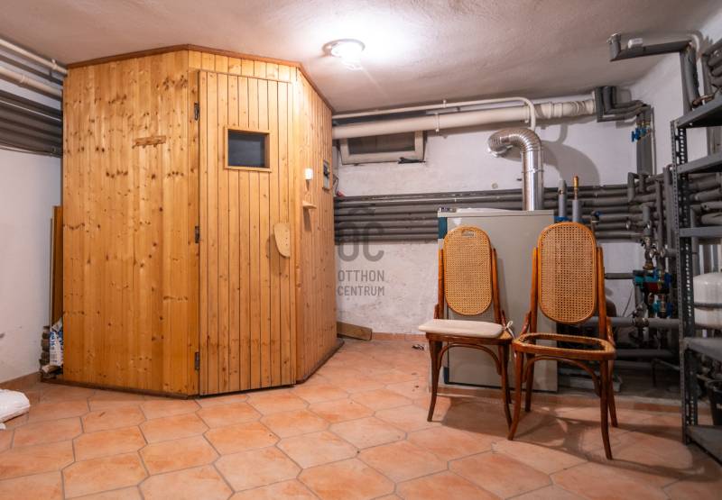 Budafokon, a XI. és a XXII. kerület határán, egy 286 nm lakóterületű, alápincézett, belső két szintes, remek adottságú, korának megfelelő állapotú családi ház eladó dupla garázzsal és intim kerttel.Környék:Budafok XI. kerülettel határos, lankás területén, csendes, kertvárosias, családi házakkal beépített részen járunk.Közlekedés:150B, 251, 251A, 251E buszok megállója fél percnyi sétával elérhető.Kert:Az utca felől a kíváncsi tekintetektől védett, dísznövényekkel, termő gyümölcsfákkal és virágokkal tarkított, gondozott terület övezi az építményt.A kert alatt zöld-tetős, 2 állásos garázs épültÉpület:Az 1993-ban épült, betonfödémes, tégla falazatú házat neves építésziroda tervezte, egyedi belsőépítészeti megoldások jellemzik.Sajátos térformálási és burkolati megoldások, faberakások és az ablakok formai megoldása különleges hangulatot sugároznak. A nyílászárók fa, kétrétegű üvegezésű, hőszigetelt ablakok.Földszintjén tágas nappali kandallóval, kilátással az óriási teraszra és a kertre, nagy hálószoba, konyha-étkező, kamra és tusoló-wc kapott helyet.Pinceszintjén, melyet a konyhából közelíthetünk meg, zuhanyzó, vízkezelő, finn szauna, kamra, kazán és mosókonyha van.Az emeletről a Szécsényi-hegytől a Citadellán át Pestig nyíló panorámát csodálhatjuk. Itt egy előtérből 3 nagy belmagasságú, külön bejáratú szoba és egy kádas fürdőszoba közelíthető meg a galériáról.Az ár alku nélküli végár. |