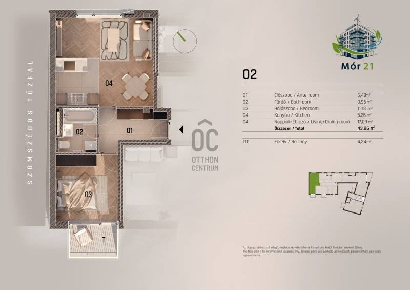 Projekt bemutatásaA Mór utca és Dévényi utca sarkán, egy hangulatos saroktelken épül fel ez a 23 lakásos, modern megjelenésű, mégis a környezetébe harmonikusan illeszkedő társasház. A kivitelezés során kiemelt figyelmet kapott a benapozás, a jól élhető terek kialakítása, valamint a magas műszaki tartalom.Az épület földszint + 5 emelet kialakítású, pinceszinttel, ahol teremgarázs és tárolók is helyet kaptak. Minden szinten ergonomikusan megtervezett, kiváló elosztású lakások találhatók, jellemzően 42–90 m² közötti alapterülettel. A legtöbb lakáshoz saját loggia, erkély vagy terasz tartozik – a felső szinten exkluzív nagy teraszos lakások kerültek kialakításra.A társasház minden szempontból megfelel a mai kor elvárásainak:– 23 parkolóhely (12 a pinceszinten, 11 a földszinten), Elektromos autó töltési lehetőséggel– 6 tároló,– zöldtető és közösségi tetőkert,– geotermikus hőszivattyús fűtés és hűtés,– padlófűtés, fan-coil hűtés,– háromrétegű nyílászárók, korszerű hő- és hangszigetelés,– liftes megközelítés minden szinten.Az épület anyaghasználata prémium minőségű: terrakotta árnyalatú burkolólapok, világosszürke betonhatású elemek és szignálfehér falfelületek teszik igazán különlegessé a házat.A kiváló infrastruktúrájú környék – Jász utca, Lehel út, Róbert Károly körút, M3-as közelsége – garantálja a gyors közlekedést, míg a környező parkok, új fejlesztések és szolgáltatások emelik a lakók életminőségét.Ez a projekt ideális választás lehet városi otthont keresőknek, tudatos befektetőknek és azoknak, akik értékelik a magas minőséget és az élhető, modern lakókörnyezetet. |
