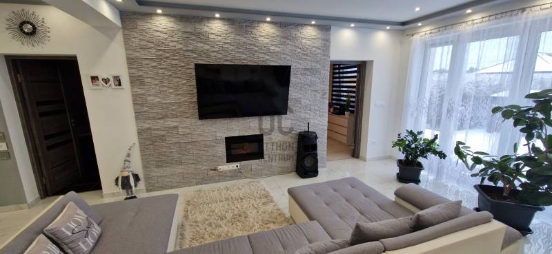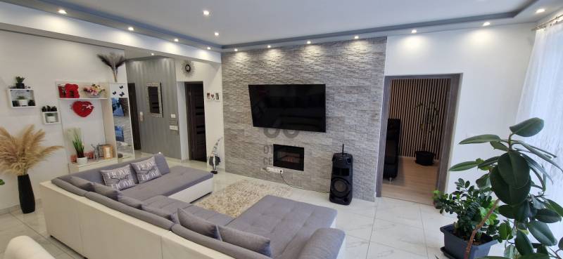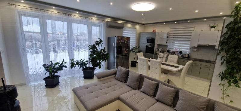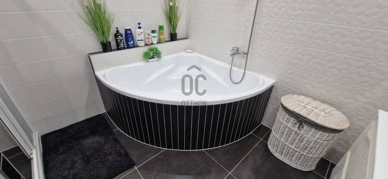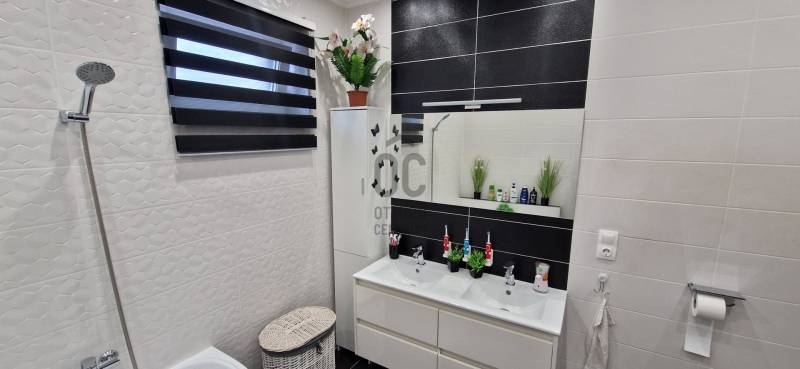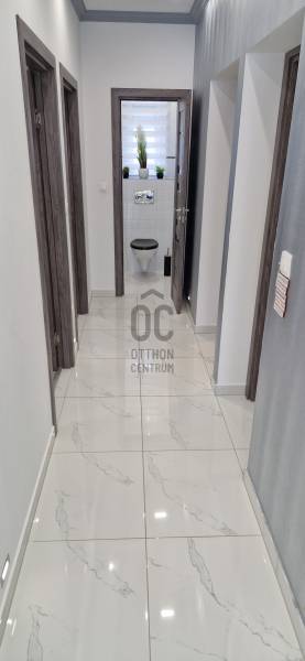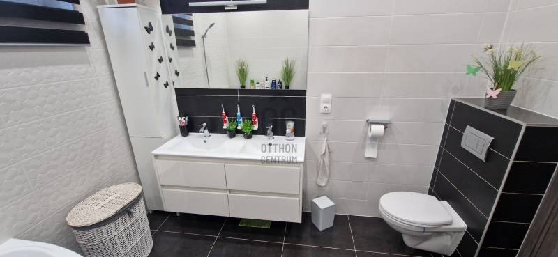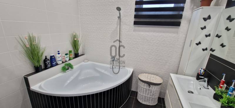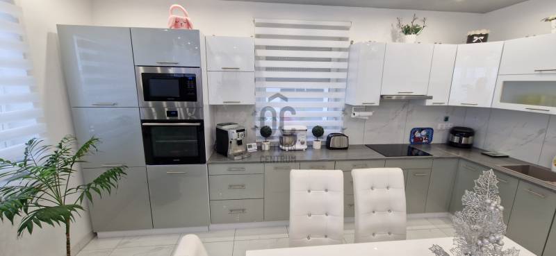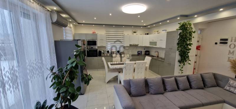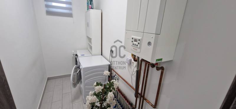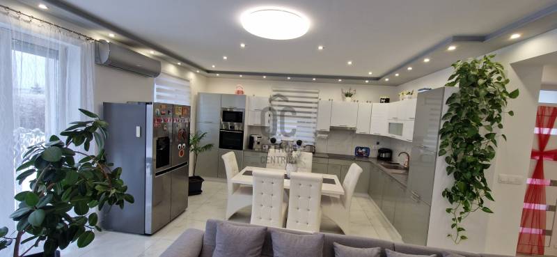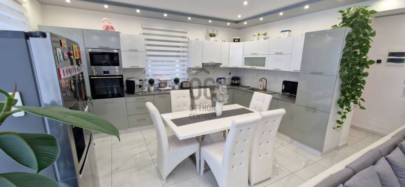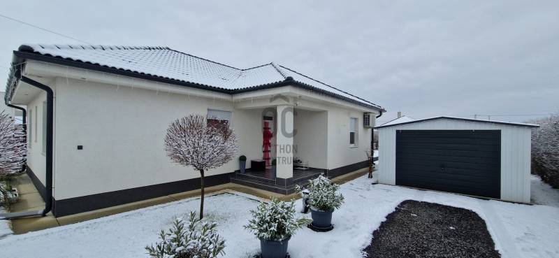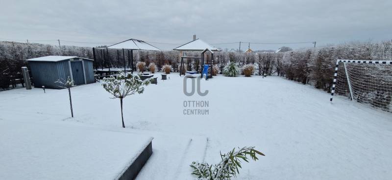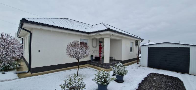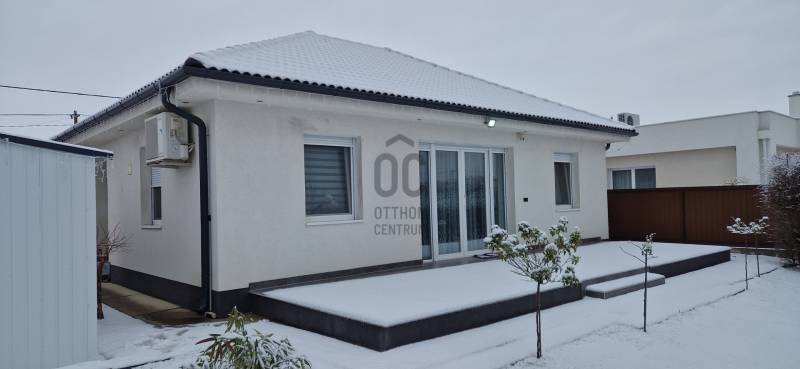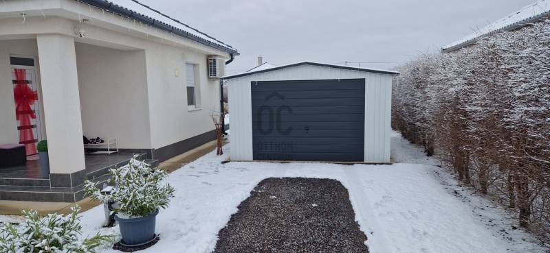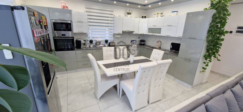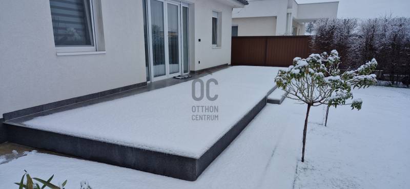 Mikepércs központjának közelében, új építésű házak között eladó egy 2022-ben épült, szinte új, nagyon szép állapotú, bruttó 132 m2-es, földszintes, nappali-amerikai konyha + 4 külön nyíló szobás, önálló, dupla komfortos családi ház, 800 m2 -es parkosított telken, 24 m2-es (6X4 m) beton alapra épült könnyűszerkezetes garázzsal.További tulajdonságai:* 4 külön nyíló szoba, laminált parketta burkolattal* 3 rétegű üveggel szerelt, hőszigetelt műanyag nyílászárók redőnnyel, rovarhálóval szerelve - a teraszajtóra elektromos redőny került* Porotherm 30 NF tégla + 15 cm hőszigetelés, 20 cm födémszigetelés* Bramac cserép héjazat* Nagy méretű, modern, gépesített konyhabútor, újszerű gépekkel* Minden helyiségben padlófűtés van* A fedett előtér mellett 29 m2-es hátsó terasz kapcsolódik a nappalihoz* Nagy méretű fürdőszoba, igényes burkolatokkal, WC-vel, zuhanyzóval* Külön WC kézmosóval* Járható, pakolható padlástér* Betonkerítés, elektromos kapunyitóval* Nappaliban látványkandalló* LED lámpák és LED-es rejtett világítás* Szuper alacsony rezsivel fenntarthatóAz utcában az utolsó 100 méteren nincs még kiépítve az aszfaltos út, de az önkormányzat építési terve tartalmazza az új építésű házak előtti rész aszfaltozását is. Jelenleg a szennyvíz hálózat is 100 méterre van, a hálózatfejlesztést 2026-ra ígéri az önkormányzat, addig a 20 m3-es acél tartály áll rendelkezésre. Az ingatlan kiváló állapotban van, a tulajdonos burkolóként saját magának burkolta, hibátlan munkával. Ebbe az önálló családi házba valóban csak be kell költözni, győződjön meg róla személyesen! További információkért és megtekintési időpontért várjuk hívását a hét minden napján!Újszerű, igényes, modern, földszintes, önálló családi ház, parkosított, kert, MikepércsEz az ingatlan a \"Felező csomag\" megbízási portfólióhoz tartozik. Részletek az Otthon Centrum weboldalán. |