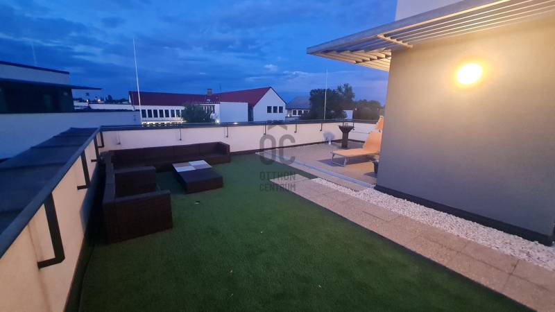 Belvároshoz közel mégis csendes helyen kiadó egy négyszobás penthouse lakásA Belvároshoz és Déli Ipari Parkhoz egyarán közel (EcoPro, Vitesco, KRONES, CATL, SEMCORP), (mindössze 8 perce autóval, vagy 18 percre busszal) de mégis csendes helyen, kiadó egy néhány éve épült, kiváló állapotú háromszobás lakás!Az ingatlan kiváló adottságokkal rendelkezik, mivel a hozzá tartozó hatalmas terasz páratlan lehetőséget kínál a szabadidő eltöltésére!A tágas és fényes nappali-étkező mellett 3 különnyíló szoba, valamint 2 fürdőszoba és egy minden igényt kielégítő gardrób található a lakótérben.A negyedik szoba berendezése igény szerint alakítható, akár dolgozószoba, vagy hálószoba kialakítása is megoldható! Az épületen elhelyezett napelemeknek és a modern szigetelésnek köszönhetően a lakás fenntartási költsége kedvező.A kellemes hőérzetről a téli időszakban padlófűtés, míg nyáron mennyezethűtés gondoskodik! A konyha minden szükséges eszközzel felszerelt, mikró, mosogatógép, sütő, főzőlap, rejtett páraelszívó.A lakóközösség kicsi, tagjai kedvesek!A lakáshoz egy saját garázs tartozik, amelynek költségét, már tartalmazza a bérleti díj! A társasház előtt 2 további autó parkolása is megoldható.A szerződéskötéshez 2 havi kaució és az első havi bérleti díj szükséges.A környék infrastruktúrája, biztosítja a kényelmes mindennapokat, mivel iskola, gyógyszertár, orvosi rendelő, McDonalds, Interspar is található egy rövid séta távolságra.A lakás, február 1.-től bérelhető!Forduljon hozzám bizalommal, akár hétvégén, vagy az esti órákban is! |
