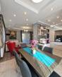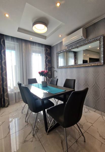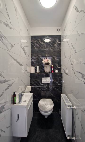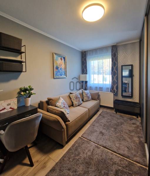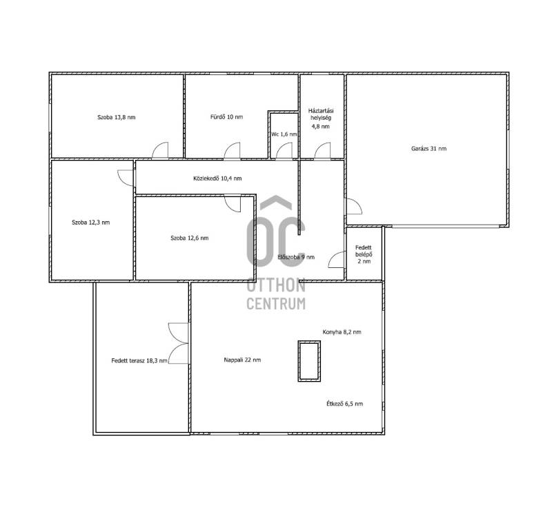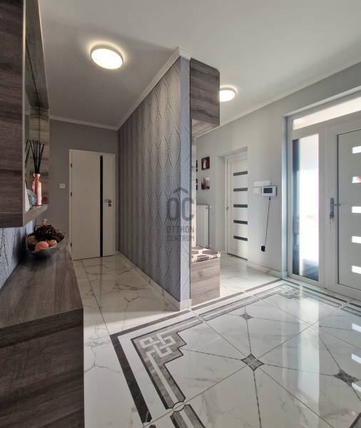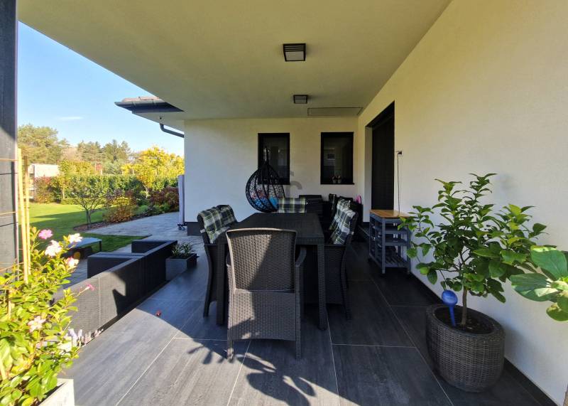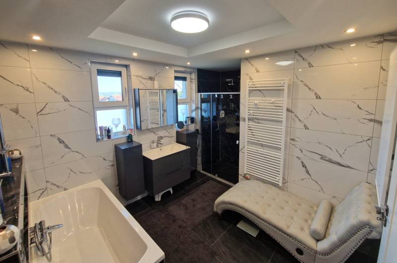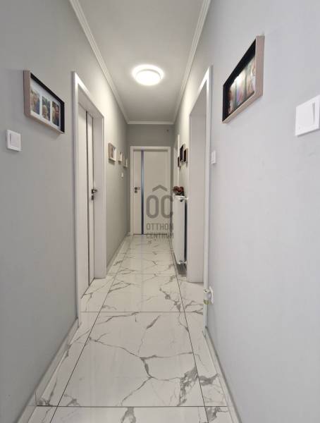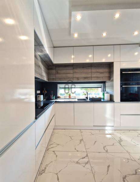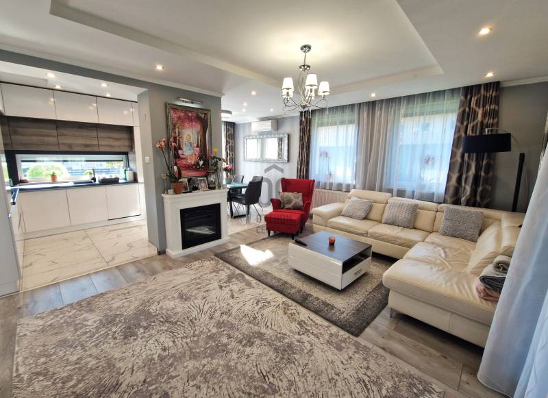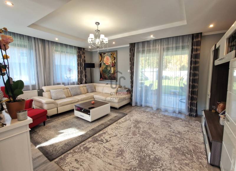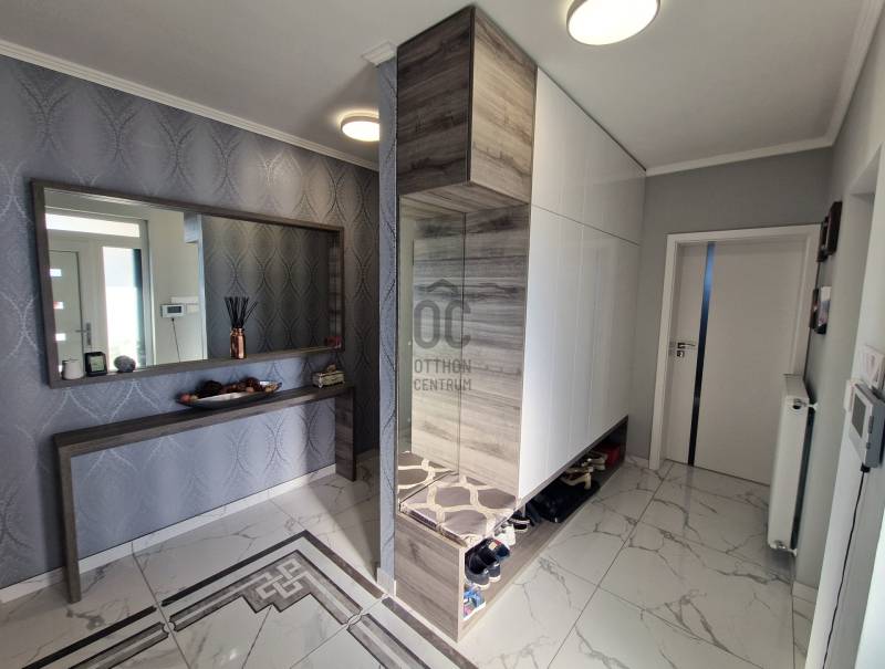 Eladó Erdőkertes Háromház városrészében új építésű házak környezetében egy újszerű, modern, 2020-ban - egyedi tervek alapján, magas műszaki tartalommal, és minőségi anyagokkal - épült, 155 nm-es, földszintes 4 szobás önálló családi ház. Elosztása három normál méretű szobát, beépített szekrénnyel rendelkező előszobát, tágas, a 20 nm-es fedett terasszal kapcsolatos nappalit, gépesített konyhát, étkezőt, háztartási helyiséget, külön wc-t, káddal és zuhanyzóval is rendelkező nagy fürdőszobát és egy dupla állásos, közvetlen előszoba kapcsolatos fűtött, gumi parkolási ütközővel is ellátott garázst foglal magába. A 12 cm-es külső és 20 cm-es mennyezeti szigeteléssel ellátott épületet, telefonnal vezérelhető termosztáttal ellátott Immergas kondenzácíós gázkészülék fűti, radiátoros központi rendszeren keresztül. Az ingatlan esztétikai és műszaki tartalmát gazdagítják egyedi kivitelezési megoldásai, számtalan intelligens extrával - Somfy IO intelligens otthon - is kiegészülve, melyek a teljesség igénye nélkül a következők: Alumínium színezett csatornarendszer, riasztó rendszer mozgásérzékelőkkel és kamerarendszerrel, Honeywell típusú vízszűrő, három rétegű kívülről színes, szúnyoghálóval és alumínium színezett külső párkányokkal is ellátott műanyag nyílászárók, egyedi porta beltéri nyílászárók, AH típusú kívülről színezett biztonsági bejárati ajtó, alumínium színezett redőnyök telefonról vezérelhető motormozgatással, kívülről színezett Rimessa dupla garázskapu mely szintén telefonról vezérelhető, ahogyan a kétszárnyú kertkapu és a 3,5 kw-os Hitachi inverteres split klima is. Az áramellátást 3*16 A biztosítja, 7,5 kw-os napelemrendszer áll rendelkezésre, például a garázsban elhelyezett 3 fázisú Wallbe elektromos autótöltő, és nappaliban található elektromos kandalló üzemeltetésére. A 834 nm-es telek, a több autó beállását is biztosító térkövezett felületen és egy 9 nm-es tárolón túl, parkosított udvarral rendelkezik, melyet robot fűnyíró és wifiről vezérelhető, locsoló almérőre kötött autómata öntözőrendszer segít karban tartani. Az ingatlan tehermentes, jogilag rendezett, várja minőségi és kényelemes otthonra vágyó új lakóit.Ha felkeltettem érdeklődését, várom hívását! |