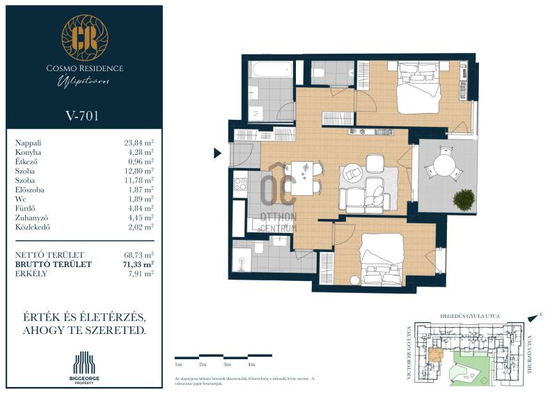 Projekt bemutatásaBudapest egyik legvonzóbb és legkeresettebb városrészében, Újlipótváros szívében egy új, exkluzív lakópark épül: az Cosmo Residence. A Hegedűs Gyula, Visegrádi, Victor Hugo és Thurzó utcák által körülhatárolt területen elhelyezkedő ingatlanfejlesztés a városrész ikonikus, nagypolgári hangulatát ötvözi, modern életstílussal, magas színvonalú építészeti megoldásokkal és első osztályú kényelemmel.A Cosmo Residence nemcsak egy újabb lakópark – hanem egy életstílus, amely a belvárosi pezsgést és a nyugodt, zöld környezetet egyaránt biztosítja lakóinak. Az ingatlan 2027. első felére készül el, és összesen 230 változatos méretű és elrendezésű lakást kínál, a 32 m2-es stúdiólakásoktól kezdve egészen a tágas, 125 m2-es, nappali + három hálószobás lakásokig. A legtöbb lakás erkéllyel rendelkezik, a legfelső szinten pedig exkluzív penthouse lakások várják azokat, akik a privát tetőterasz nyújtotta különleges panorámát szeretnék élvezni.A lakások tervezésekor több mint 4000 vevői visszajelzést vettünk figyelembe, így a terek és elrendezések maximálisan alkalmazkodnak a mai modern élet igényeihez. A belső kialakítások során lehetőség van egyedi igények figyelembevételére is, amit belsőépítészeti kollekciók segítenek. A 8 szintes épületben változatos méretű üzlethelyiségek is kialakításra kerülnek, melyek a földszinten kapnak helyet, további kényelmet biztosítva a lakók számára.A Biggeorge Property legújabb fejlesztése, a Cosmo Residence Budapest 13. kerületének közkedvelt helyszínén, Újlipótváros szívében épül, a Hegedűs Gyula, Visegrádi, Victor Hugo és Thurzó utca által határolt területen. A környék hangulatát tükröző épület 230 energiahatékony otthont kínál, amelyek megfelelnek a legújabb környezettudatos elvárásoknak. A fejlesztés részeként üzletek, tárolók és gépkocsi-beállók is kialakításra kerülnek, amelyek tovább növelik az épület lakóinak kényelmét. |