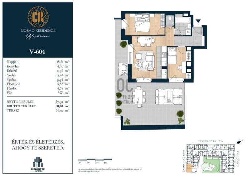 Projekt bemutatásaBudapest egyik legvonzóbb és legkeresettebb városrészében, Újlipótváros szívében egy új, exkluzív lakópark épül: az Cosmo Residence. A Hegedűs Gyula, Visegrádi, Victor Hugo és Thurzó utcák által körülhatárolt területen elhelyezkedő ingatlanfejlesztés a városrész ikonikus, nagypolgári hangulatát ötvözi, modern életstílussal, magas színvonalú építészeti megoldásokkal és első osztályú kényelemmel.A Cosmo Residence nemcsak egy újabb lakópark – hanem egy életstílus, amely a belvárosi pezsgést és a nyugodt, zöld környezetet egyaránt biztosítja lakóinak. Az ingatlan 2027. első felére készül el, és összesen 230 változatos méretű és elrendezésű lakást kínál, a 32 m2-es stúdiólakásoktól kezdve egészen a tágas, 125 m2-es, nappali + három hálószobás lakásokig. A legtöbb lakás erkéllyel rendelkezik, a legfelső szinten pedig exkluzív penthouse lakások várják azokat, akik a privát tetőterasz nyújtotta különleges panorámát szeretnék élvezni.A lakások tervezésekor több mint 4000 vevői visszajelzést vettünk figyelembe, így a terek és elrendezések maximálisan alkalmazkodnak a mai modern élet igényeihez. A belső kialakítások során lehetőség van egyedi igények figyelembevételére is, amit belsőépítészeti kollekciók segítenek. A 8 szintes épületben változatos méretű üzlethelyiségek is kialakításra kerülnek, melyek a földszinten kapnak helyet, további kényelmet biztosítva a lakók számára.A Biggeorge Property legújabb fejlesztése, a Cosmo Residence Budapest 13. kerületének közkedvelt helyszínén, Újlipótváros szívében épül, a Hegedűs Gyula, Visegrádi, Victor Hugo és Thurzó utca által határolt területen. A környék hangulatát tükröző épület 230 energiahatékony otthont kínál, amelyek megfelelnek a legújabb környezettudatos elvárásoknak. A fejlesztés részeként üzletek, tárolók és gépkocsi-beállók is kialakításra kerülnek, amelyek tovább növelik az épület lakóinak kényelmét. |