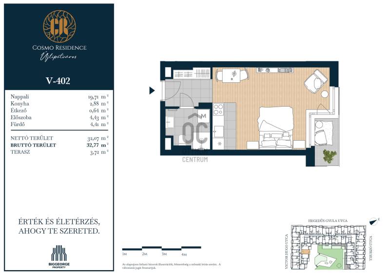 Projekt bemutatásaBudapest egyik legvonzóbb és legkeresettebb városrészében, Újlipótváros szívében egy új, exkluzív lakópark épül: az Cosmo Residence. A Hegedűs Gyula, Visegrádi, Victor Hugo és Thurzó utcák által körülhatárolt területen elhelyezkedő ingatlanfejlesztés a városrész ikonikus, nagypolgári hangulatát ötvözi, modern életstílussal, magas színvonalú építészeti megoldásokkal és első osztályú kényelemmel.A Cosmo Residence nemcsak egy újabb lakópark – hanem egy életstílus, amely a belvárosi pezsgést és a nyugodt, zöld környezetet egyaránt biztosítja lakóinak. Az ingatlan 2027. első felére készül el, és összesen 230 változatos méretű és elrendezésű lakást kínál, a 32 m2-es stúdiólakásoktól kezdve egészen a tágas, 125 m2-es, nappali + három hálószobás lakásokig. A legtöbb lakás erkéllyel rendelkezik, a legfelső szinten pedig exkluzív penthouse lakások várják azokat, akik a privát tetőterasz nyújtotta különleges panorámát szeretnék élvezni.A lakások tervezésekor több mint 4000 vevői visszajelzést vettünk figyelembe, így a terek és elrendezések maximálisan alkalmazkodnak a mai modern élet igényeihez. A belső kialakítások során lehetőség van egyedi igények figyelembevételére is, amit belsőépítészeti kollekciók segítenek. A 8 szintes épületben változatos méretű üzlethelyiségek is kialakításra kerülnek, melyek a földszinten kapnak helyet, további kényelmet biztosítva a lakók számára.A Biggeorge Property legújabb fejlesztése, a Cosmo Residence Budapest 13. kerületének közkedvelt helyszínén, Újlipótváros szívében épül, a Hegedűs Gyula, Visegrádi, Victor Hugo és Thurzó utca által határolt területen. A környék hangulatát tükröző épület 230 energiahatékony otthont kínál, amelyek megfelelnek a legújabb környezettudatos elvárásoknak. A fejlesztés részeként üzletek, tárolók és gépkocsi-beállók is kialakításra kerülnek, amelyek tovább növelik az épület lakóinak kényelmét. |