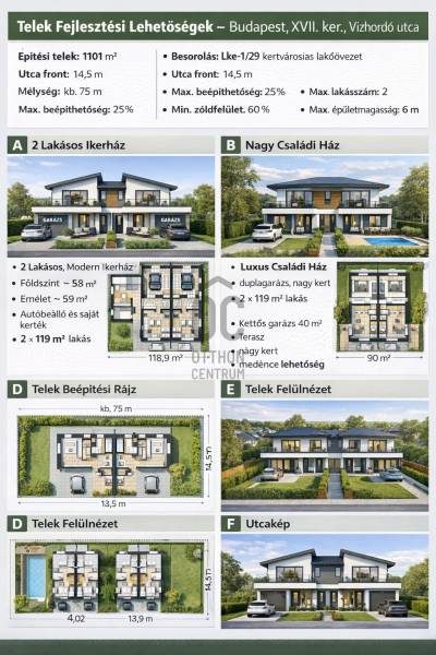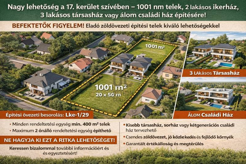 Nagy lehetőség a XVII. kerületben – 1101 m² építési telek!Eladó Budapest XVII. kerületében, a Vízhordó utcában egy 1101 m²-es építési telek, amely kiváló lehetőséget kínál családi ház vagy ikerház építésére.A telek 14,5 méter utcafronttal rendelkezik, hosszúkás kialakításának köszönhetően pedig könnyen beépíthető.Az ingatlan Lke-1/29 kertvárosias lakóövezetben található, ahol az alábbi beépítési paraméterek érvényesek:maximum 1 főépületmaximum 2 lakás25% beépíthetőség60% kötelező zöldfelület6 méter maximális épületmagasságA telek mérete lehetővé teszi ikerház kialakítását, ahol mindkét lakás saját kerttel és akár garázzsal is rendelkezhet.A közművek az utcában elérhetők (víz, gáz, villany, csatorna), így a fejlesztés könnyen megvalósítható.A környék csendes kertvárosi övezet, családi házas környezettel és jó közlekedési kapcsolatokkal.Ideális választás:befektetőknekkivitelezőknekcsaládi ház építéséhezHa egy értékálló fejlesztési lehetőséget keres Budapest egyik nyugodt kertvárosi részén, ez a telek kiváló választás.Ne hagyja ki ezt a ritka lehetőséget – keressen bizalommal további információért és egyeztetésért! |