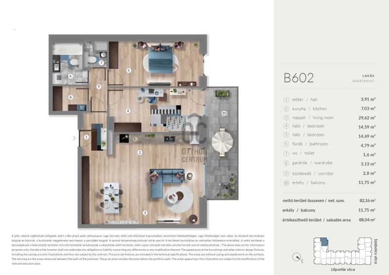 Projekt bemutatásaA kiváló elhelyezkedésű WestGate 4 lakópark a Dózsa György úttól és a Lehel úttól pár lépésre található, így a Belváros könnyedén megközelíthető autóval és tömegközlekedéssel egyaránt. A 4 ütemben épülő lakóparkban összesen közel 1000 lakás kerül megépítésre, melyből az első három ütem elkészültével több mint 700 lakás átadása már megtörtént.2-3-4 szobás lakástípusok elérhetőek, a csendes belső kertre néző családi otthontól a kisvárosias utcára néző lakáson keresztül az indusztriális-városi panorámát kedvelőkig mindenki megtalálhatja a hozzá illő ingatlant.A jelenleg legkorszerűbb hőszivattyús rendszer lehetővé teszi az otthonok energiatakarékos fenntarthatóságát. Lakásonként hőmennyiségméréssel ellátott felület fűtés-hűtés kerül kialakításra, interneten keresztül távolról elérhető és programozható, valamint kézi hőmérsékletállítási lehetőséggel,rejtett gépészeti vezetékekkel.A lakásokba okosotthon rendszer kerül beépítésre. Az okosotthon rendszer biztosítja a lakások magasabb szintű és hatékony üzemeltetését. A Vevőneklehetősége van három, különböző típusú okosotthon rendszer (alapcsomag) közül választani, amelyek egyike sem eredményezi a lakások vételárának növekedését.Igény esetén felár ellenében lehetőség van beépített bútorok megrendelésére is.A lakásokhoz mélygarázsban biztosított parkoló vásárolható, illetve emeleti tárolók is leköthetők.Extrák az épületben: közösségi nappali, könyvtár, közösségi autó, fészer és csomagpont valamint az összes lakás okosotthon-rendszerrel allátva kerül átadásra.Rohamosan fejlődő környék, remek befektetés!Fizetési ütemezés:10% - szerződéskötéskor90% - átadáskor (használatbavételi engedélyt követően)Várható átadás: 2027.12.31. |