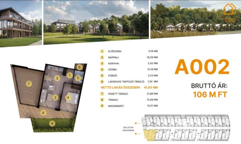 Balatonföldvár: Balatonföldvár fontos turisztikai célpont, nemcsak a magyarok, hanem más európai országok turistái számára is, természeti szépségei (például a löszhegy és a nagy virágos parkok), továbbá történelmi örökségei (például a kelta ösvény, a régi kúriák és villák) miatt számtalan szabadidős lehetőséget, valamint számos vízi sportot (vitorlázás, szörfözés, horgászat, evezés)Balaton liget willapark:Lakások száma: 56 db.Alapterület: 28-56 m².A földszinti lakásokhoz saját, privát kert tartozik.A földszinten 21 lakás található, 48–110 m² közötti alapterülettel.Az első emeleten további 21 lakás érhető el, 47–75 m² közötti méretben.A második emeleten 17 lakás kapott helyet.A lakásokhoz önálló tárolóhelyiségek tartoznak, amelyek a közös folyosóról közelíthetők meg.Környezettudatos építő anyagokA+ energetikai besorolásFelszíni parkoló: 6.350.000. Ft.Modern letisztult építészet, tömegformálás, Balatonra tájolt panorámás teraszok.Apartmanlakás - alapfelszereltség:100% tömör CLT Ausztriából.20 cm kőzetgyapot hőszigetelés.Fa hőszigetelő nyílászárók 3 rétegű üvegezéssel,tölgyfurnér melegburkolat.Porcelán greslap hidegburkolat, villeroy fürdőszoba szaniterekpadlófűtés.Levegős hőszivattyú (VRV splitklíma), 50kW társasházi napelemrendszer, elektromos redőny, szúnyogháló beépített bútoroksaját terasz.A002. lakás.A további kérdésekkel és a megtekintéssel kapcsolatban kérem keressen a megadott mobil számon. |