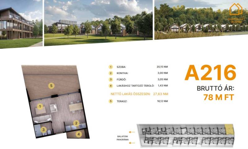 Balatonföldvár: Balatonföldvár fontos turisztikai célpont, nemcsak a magyarok, hanem más európai országok turistái számára is, természeti szépségei (például a löszhegy és a nagy virágos parkok), továbbá történelmi örökségei (például a kelta ösvény, a régi kúriák és villák) miatt számtalan szabadidős lehetőséget, valamint számos vízi sportot (vitorlázás, szörfözés, horgászat, evezés)Balaton liget willapark:Lakások száma: 56 db.Alapterület: 28-56 m².A földszinti lakásokhoz saját, privát kert tartozik.A földszinten 21 lakás található, 48–110 m² közötti alapterülettel.Az első emeleten további 21 lakás érhető el, 47–75 m² közötti méretben.A második emeleten 17 lakás kapott helyet.A lakásokhoz önálló tárolóhelyiségek tartoznak, amelyek a közös folyosóról közelíthetők meg.Környezettudatos építő anyagokA+ energetikai besorolásFelszíni parkoló: 6.350.000. Ft.Modern letisztult építészet, tömegformálás, Balatonra tájolt panorámás teraszok.Apartmanlakás - alapfelszereltség:100% tömör CLT Ausztriából.20 cm kőzetgyapot hőszigetelés.Fa hőszigetelő nyílászárók 3 rétegű üvegezéssel,tölgyfurnér melegburkolat.Porcelán greslap hidegburkolat, villeroy fürdőszoba szaniterekpadlófűtés.Levegős hőszivattyú (VRV splitklíma), 50kW társasházi napelemrendszer, elektromos redőny, szúnyogháló beépített bútoroksaját terasz.Kedvező fizetési konstrukció: 10-90 %.A 216. lakás.A további kérdésekkel és a megtekintéssel kapcsolatban kérem keressen a megadott mobil számon. |