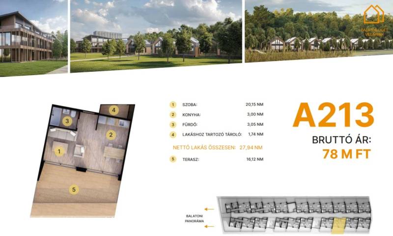 Balatonföldvár: Balatonföldvár fontos turisztikai célpont, nemcsak a magyarok, hanem más európai országok turistái számára is, természeti szépségei (például a löszhegy és a nagy virágos parkok), továbbá történelmi örökségei (például a kelta ösvény, a régi kúriák és villák) miatt számtalan szabadidős lehetőséget, valamint számos vízi sportot (vitorlázás, szörfözés, horgászat, evezés)Balaton liget willapark:Lakások száma: 56 db.Alapterület: 28-56 m².A földszinti lakásokhoz saját, privát kert tartozik.A földszinten 21 lakás található, 48–110 m² közötti alapterülettel.Az első emeleten további 21 lakás érhető el, 47–75 m² közötti méretben.A második emeleten 17 lakás kapott helyet.A lakásokhoz önálló tárolóhelyiségek tartoznak, amelyek a közös folyosóról közelíthetők meg.Környezettudatos építő anyagokA+ energetikai besorolásFelszíni parkoló: 6.350.000. Ft.Modern letisztult építészet, tömegformálás, Balatonra tájolt panorámás teraszok.Apartmanlakás - alapfelszereltség:100% tömör CLT Ausztriából.20 cm kőzetgyapot hőszigetelés.Fa hőszigetelő nyílászárók 3 rétegű üvegezéssel,tölgyfurnér melegburkolat.Porcelán greslap hidegburkolat, villeroy fürdőszoba szaniterekpadlófűtés.Levegős hőszivattyú (VRV splitklíma), 50kW társasházi napelemrendszer, elektromos redőny, szúnyogháló beépített bútoroksaját terasz.Kedvező fizetési konstrukció: 10-90 %.A 213. lakás.A további kérdésekkel és a megtekintéssel kapcsolatban kérem keressen a megadott mobil számon. |