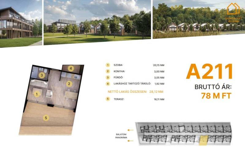 Balatonföldvár: Balatonföldvár fontos turisztikai célpont, nemcsak a magyarok, hanem más európai országok turistái számára is, természeti szépségei (például a löszhegy és a nagy virágos parkok), továbbá történelmi örökségei (például a kelta ösvény, a régi kúriák és villák) miatt számtalan szabadidős lehetőséget, valamint számos vízi sportot (vitorlázás, szörfözés, horgászat, evezés)Balaton liget willapark:Lakások száma: 56 db.Alapterület: 28-56 m².A földszinti lakásokhoz saját, privát kert tartozik.A földszinten 21 lakás található, 48–110 m² közötti alapterülettel.Az első emeleten további 21 lakás érhető el, 47–75 m² közötti méretben.A második emeleten 17 lakás kapott helyet.A lakásokhoz önálló tárolóhelyiségek tartoznak, amelyek a közös folyosóról közelíthetők meg.Környezettudatos építő anyagokA+ energetikai besorolásFelszíni parkoló: 6.350.000. Ft.Modern letisztult építészet, tömegformálás, Balatonra tájolt panorámás teraszok.Apartmanlakás - alapfelszereltség:100% tömör CLT Ausztriából.20 cm kőzetgyapot hőszigetelés.Fa hőszigetelő nyílászárók 3 rétegű üvegezéssel,tölgyfurnér melegburkolat.Porcelán greslap hidegburkolat, villeroy fürdőszoba szaniterekpadlófűtés.Levegős hőszivattyú (VRV splitklíma), 50kW társasházi napelemrendszer, elektromos redőny, szúnyogháló beépített bútoroksaját terasz.Kedvező fizetési konstrukció: 10-90 %.A 211. lakás.A további kérdésekkel és a megtekintéssel kapcsolatban kérem keressen a megadott mobil számon. |