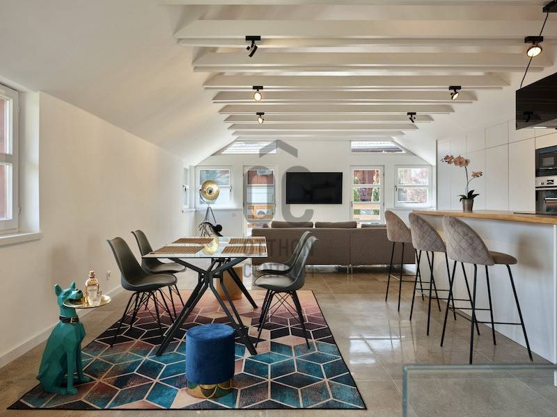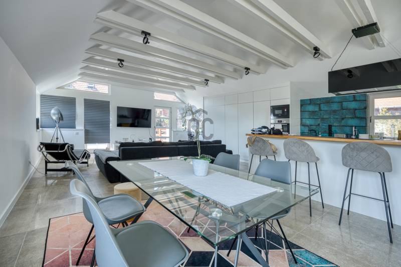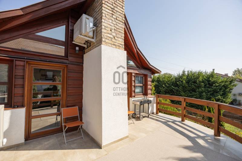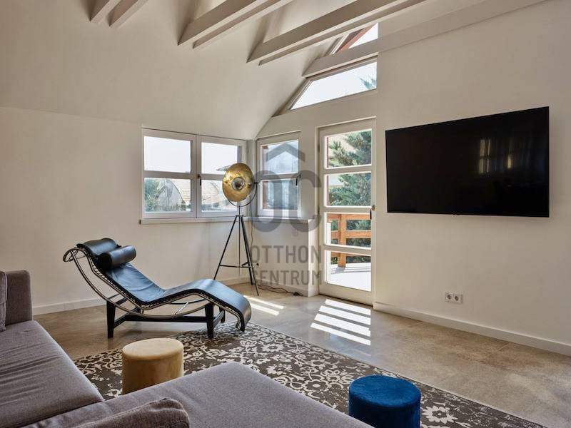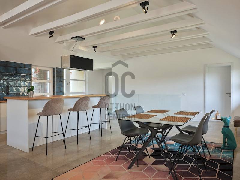 III. Róka-hegy, Csillaghegy felőli oldalában, 2 lakásos házban, első emeleti, a , luxus szinten - LOFT stílusban -, felújított, különleges hangulatú, 127 nm alapterületű, nappali + 2 hálószobás lakás, nagy méretű terasszal, gépkocsi beállóval eladó!A lakás bejárata közvetlenül a kertszintből tudunk felmenni az emeletre. A lépcső tömörfával burkolt és oldalfalba süllyesztett led világítással is rendelkezik. . A nappali – étkező – konyha egy légtérben került kialakításra. A helyiség egyedi hangulatáról a több színben is állítható PHILIPS HUE okos lámpák gondoskodnak. A matt fehér frontokkal épített konyhabútor (fékezős fiókok, push-open rendszerű ajtók) valamennyi háztartási géppel felszerelt, sütőtoronyba épített mikró és sütő, fekete színű gránit mosogató, türkizkék dekor csempével burkolt fallal, kényelmesen körbeülhető magasságú konyhaszigettel, beépített indukciós főzőlappal, sziget párelszívóval (KLARSTEIN).A nappali térből nyílik a vendég mosdó, valamint a két külön bejáratú, nagy méretű hálószoba, közöttük extra méretű, egyedi mintázatú falburkolattal rendelkező fürdőszoba, ahol dupla mosdó, kád és épített zuhany is megtalálható.Az ingatlan hűtését és fűtését a felújítás során kiépítésre került, „H” tarifás villanyóráról működtethető levegő hőszivattyús rendszer biztosítja padlófűtéssel, és hűtésre és fűtésre is alkalmas klíma beltéri (3 db) egységekkel.A lakáshoz 1 db gépkocsibeálló is tartozik, amely további 5 M Ft-ért megvásárlandó.Hívjon még ma, hogy személyesen is megtekinthesse ezt a gyönyörű otthont!Díjmentes, bankfüggetlen hiteltanácsadással támogatjuk vevő ügyfeleinket a számukra legelőnyösebb finanszírozási döntések meghozatalában. Opcionálisan igénybe vehető kiegészítő szolgáltatásainkkal – mint ügyvédi közreműködés, energetikai tanúsítvány vagy villamos biztonsági felülvizsgálat – teljes körű szakmai támogatást nyújtunk az adásvétel folyamatának minden egyes lépésénél. |