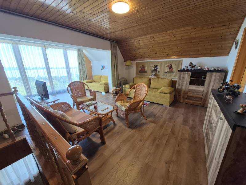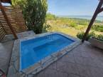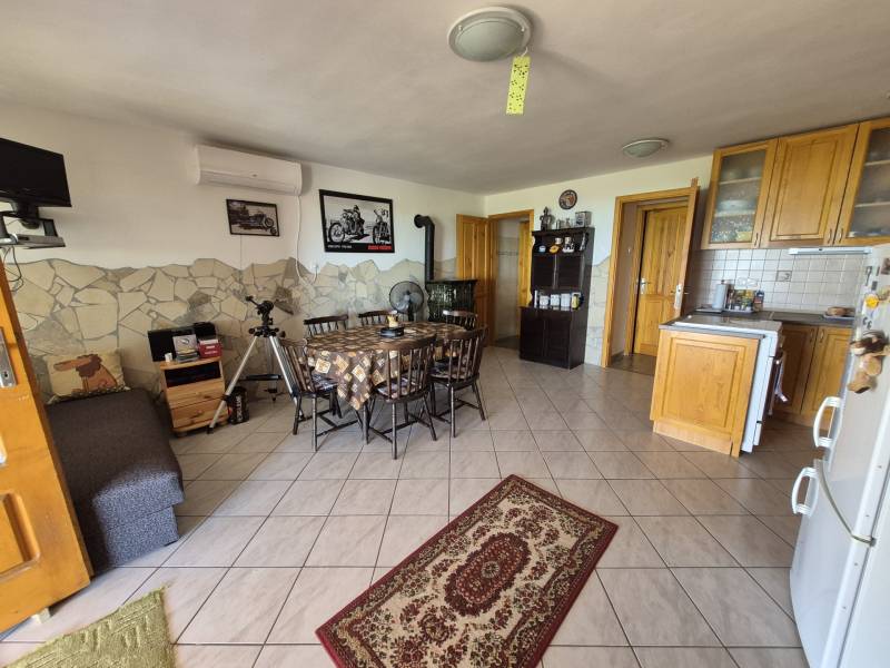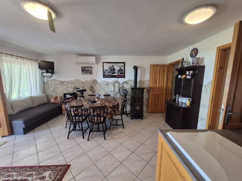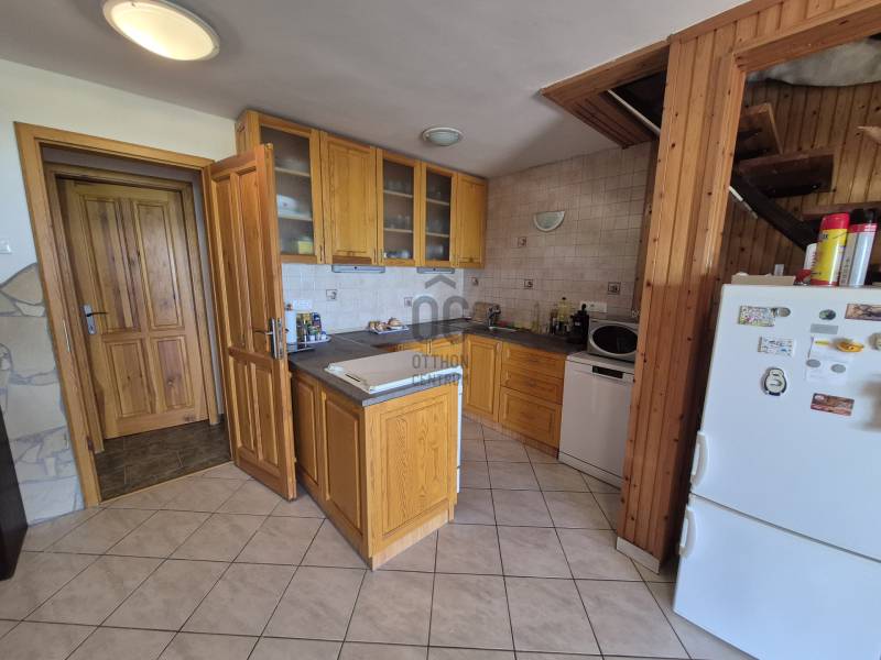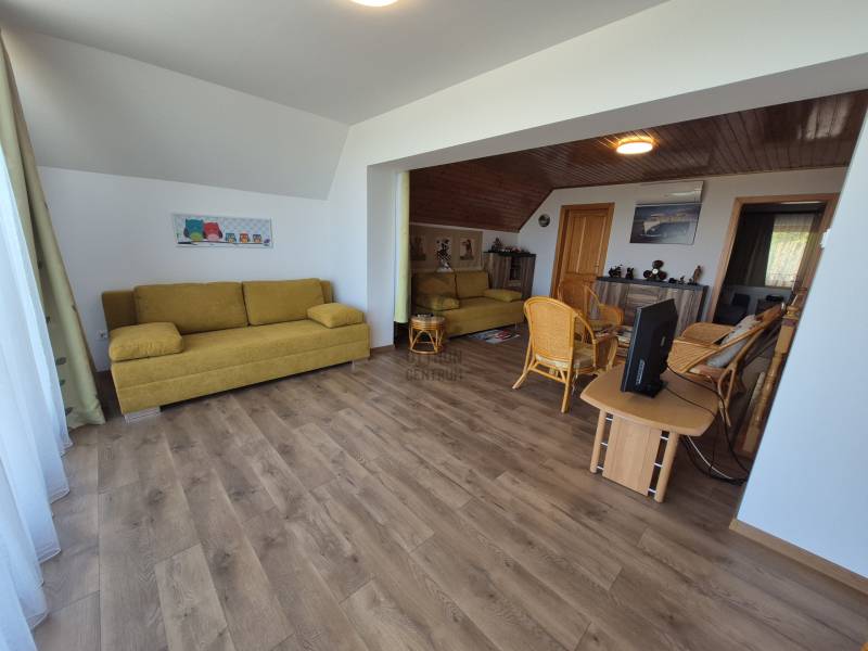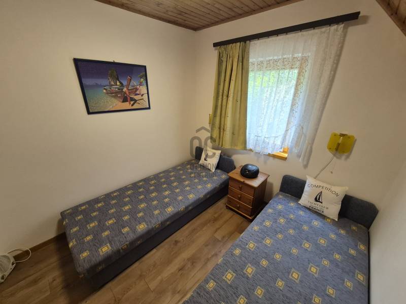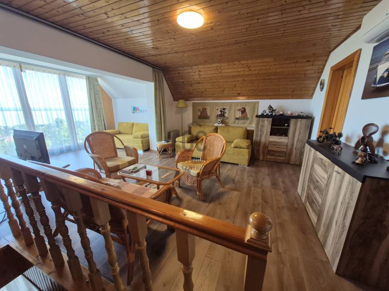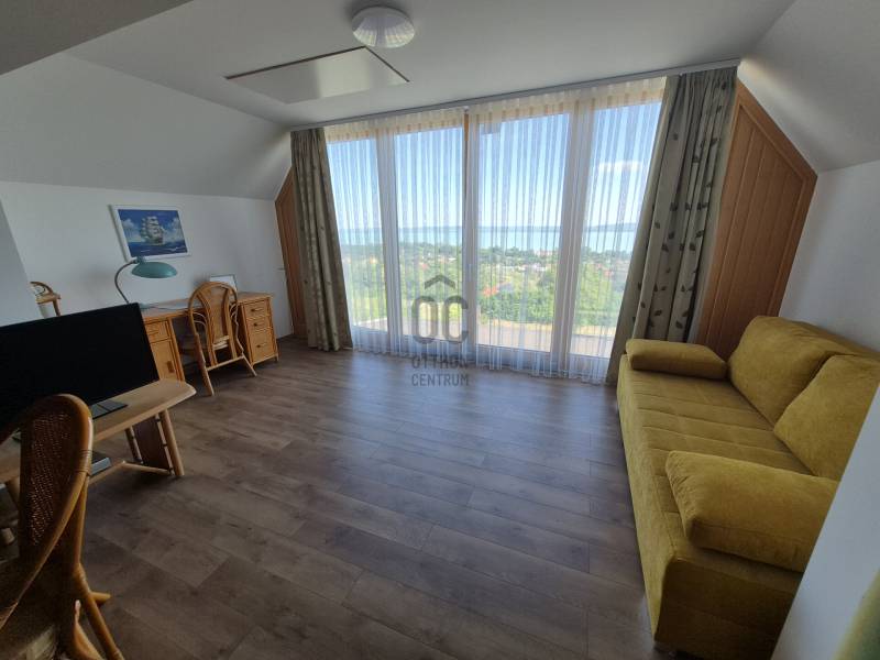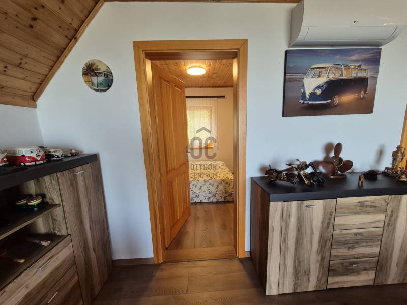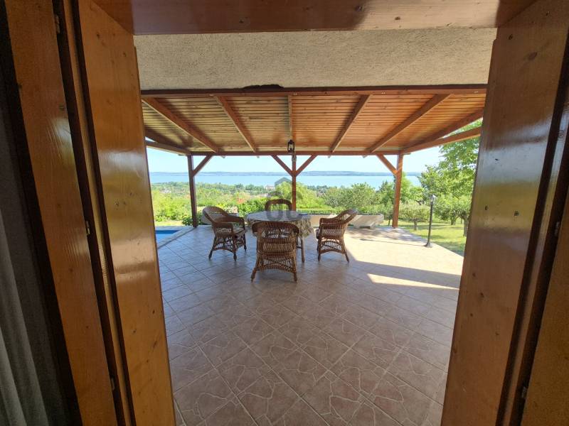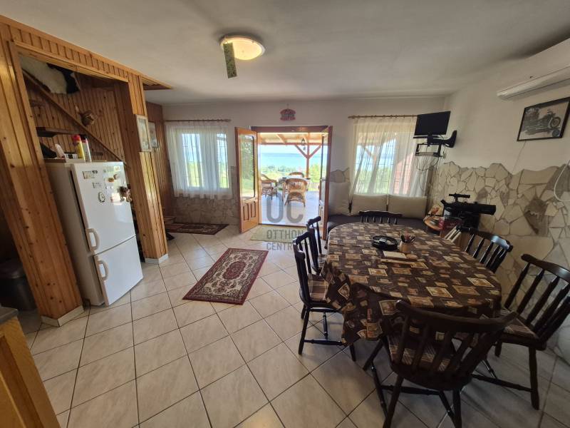 Révfülöpön ajánlom figyelmébe ezt a kifogástalan állapotú, 3 szobás nyaralót, mely a hozzá kapcsolódó 1418 nm-es telekterületével nyugodt pihenést biztosít az év minden időszakában.Az alsó szinten egy étkező-konyha-nappali fogad minket, mely közvetlenül kapcsolódik a 40nm-es teraszhoz, melynek minden pontjáról csodálatos panorámában gyönyörködhetünk.Innen nyílik még egy vendég mosdó, valamint egy kis közlekedő is, ahonnan a fürdőszobát és a kamrát közelíthetjük meg.A terasz része egy épített jakuzzi, innen egy nyáron napon is kényelmesen élvezhetjük a pazar kilátást.Ezenkívül sütögető, kültéri zuhany, kerti tároló, fúrt kút és fedett kocsibeálló is rendelkezésre áll!Az emeleten egy nagy, 35 nm-es nappaliból élvezhetjük a Tihanytól Fonyódig tartó balatoni panorámát egy hatalmas hővédő üvegfelületen keresztül, és emellett két hálószoba is található még ezen a szinten.A téglából épült nyaraló víz, villany közművekkel rendelkezik, a szennyvíz elvezetése emésztővel megoldott. A meleg vizet villany bojler adja.Fűtését cserépkályha biztosítja, az emeleten hűtő-fűtő klíma is rendelkezésre áll. Egész évben könnyen megközelíthető helyen, zsákutca végén található, melyhez magánút vezet, közeli szomszédok nincsenek, így a nyugodt pihenés garantált.A házhoz tartozó terület parkosított és szépen karbantartott, egyszerre több autó parkolása is megoldható.A helyi bolt, étterem és a révfülöpi strand is egy kényelmes sétával elérhető!Ha balatoni panorámás nyaralót keres, ezt mindenképp látnia kell! |