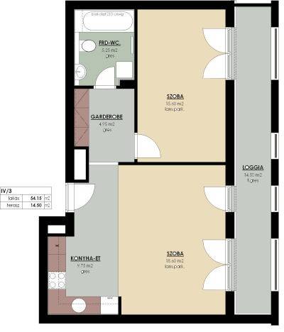- loggia 15 nm, - mindegyik szobából közvetlen kilépés ide. (Beépített szekrény)